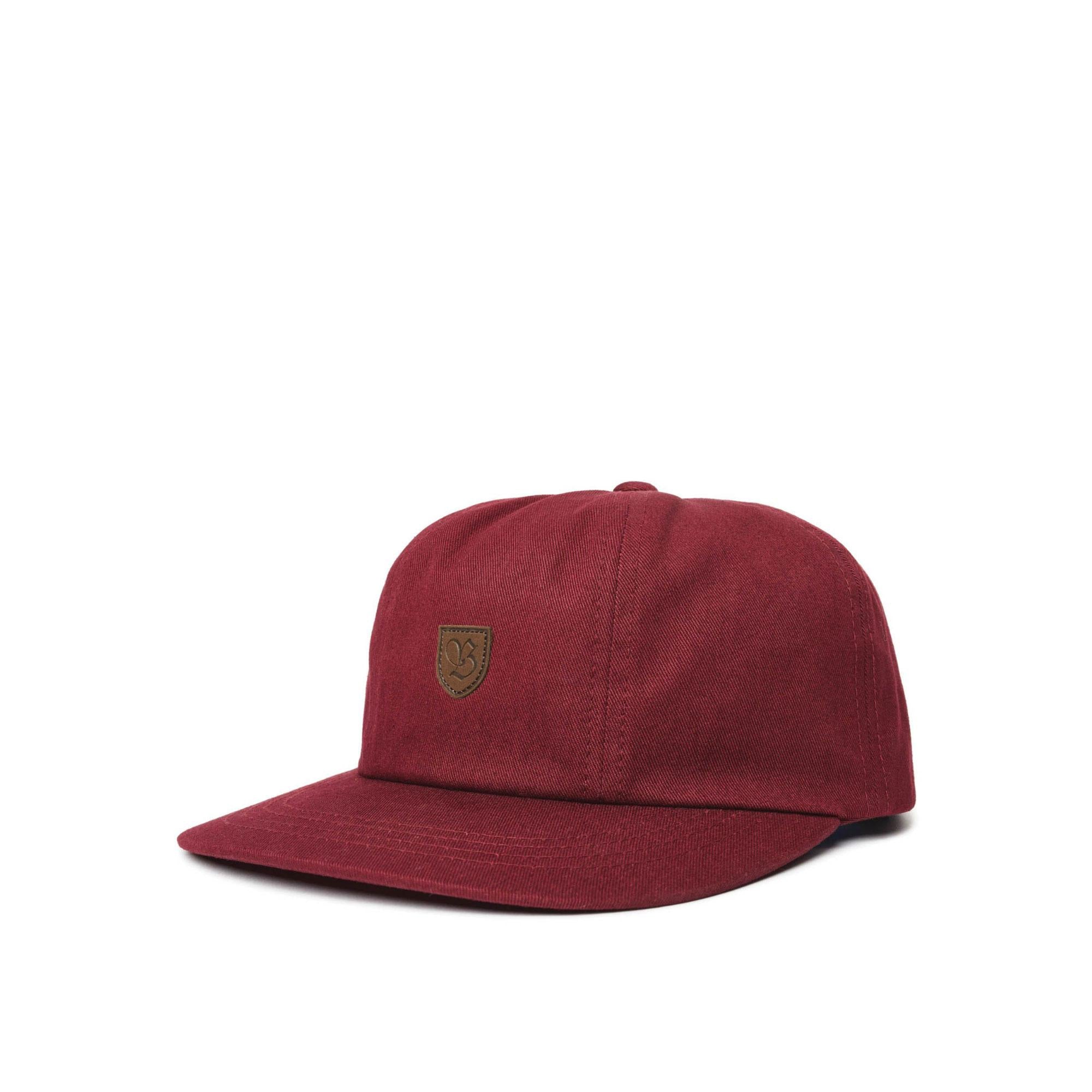 A men’s unisex custom six-panel cut-and-sew cap featuring a debossed leather patch and a leather adjuster. Color: Maroon. Imported.