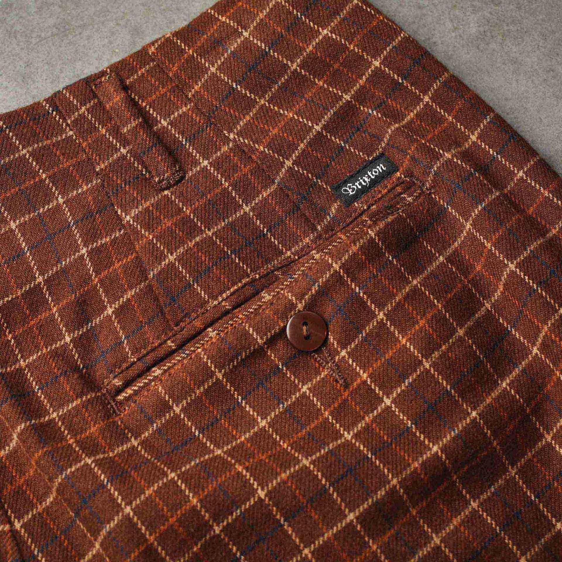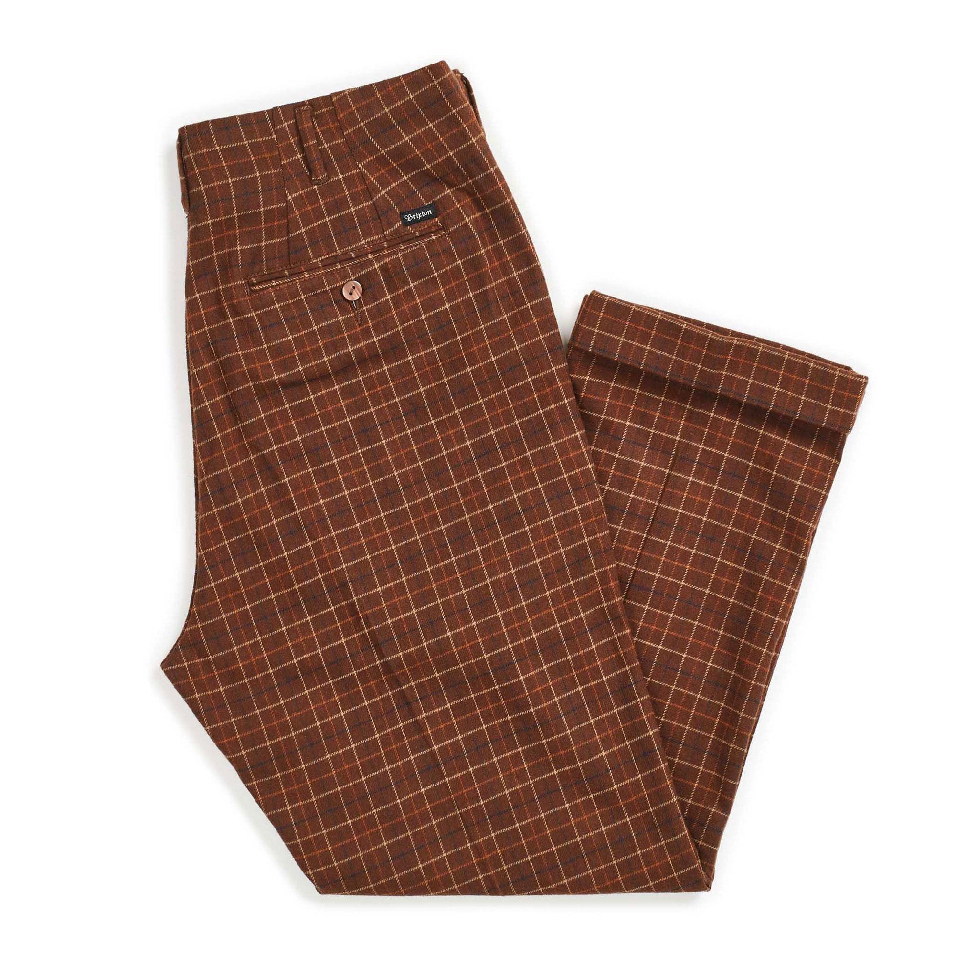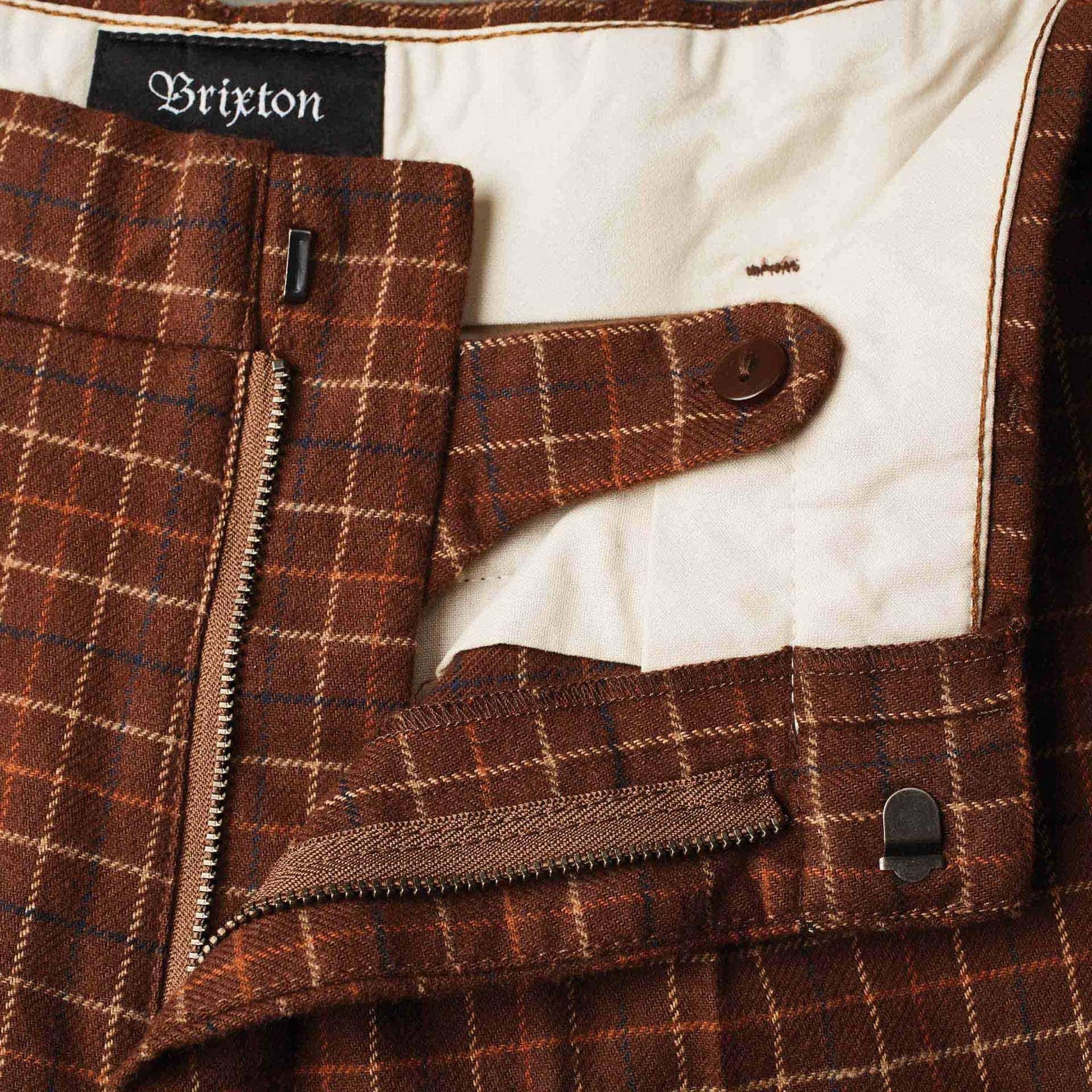 The Brixton Regent Trouser Pant is a relaxed-fit trouser pant with a tapered leg made in lightweight cotton/poly plaid twill. It features an exterior leg cuff, stay-press crease, custom Brixton labeling, graded inseam, and a 16" leg opening.