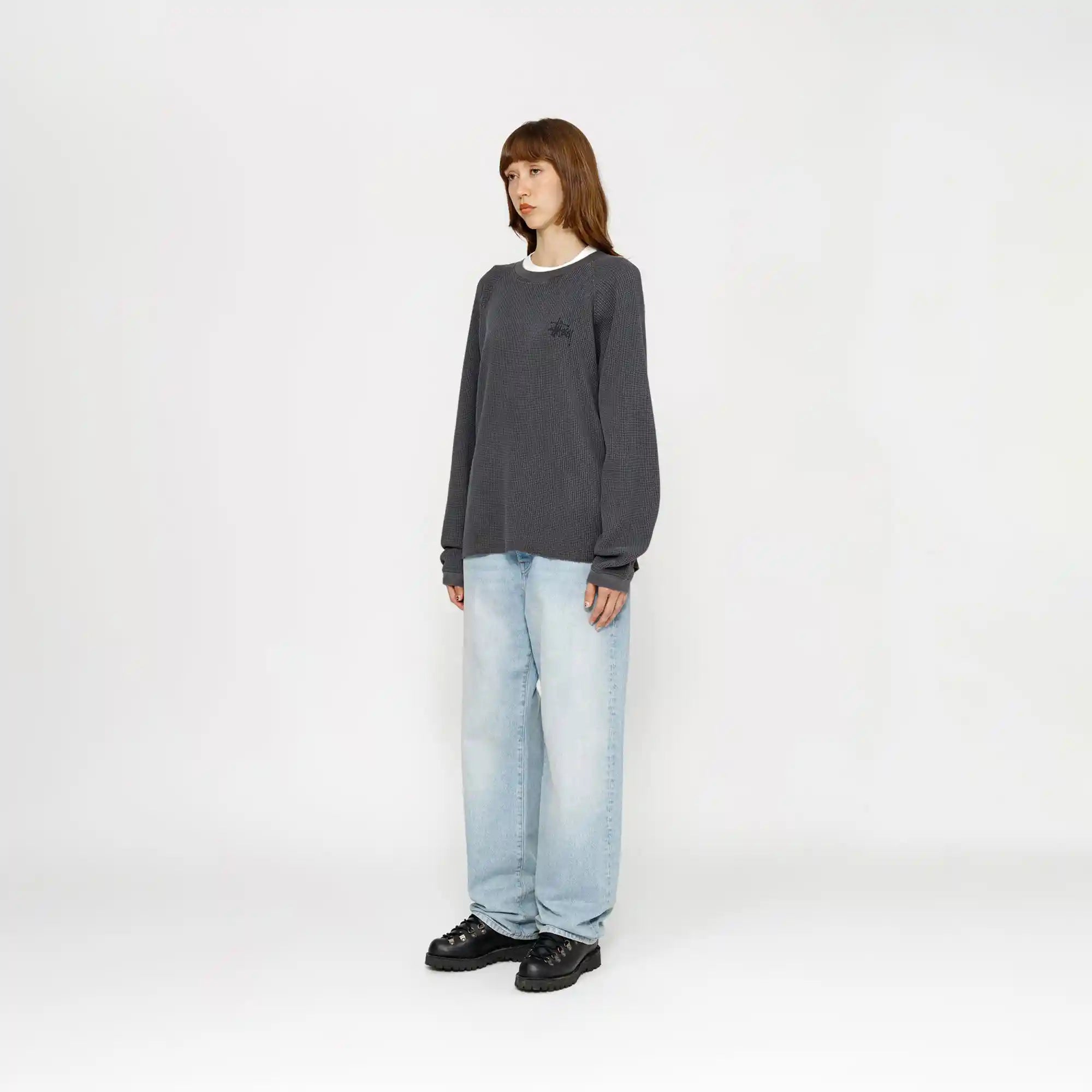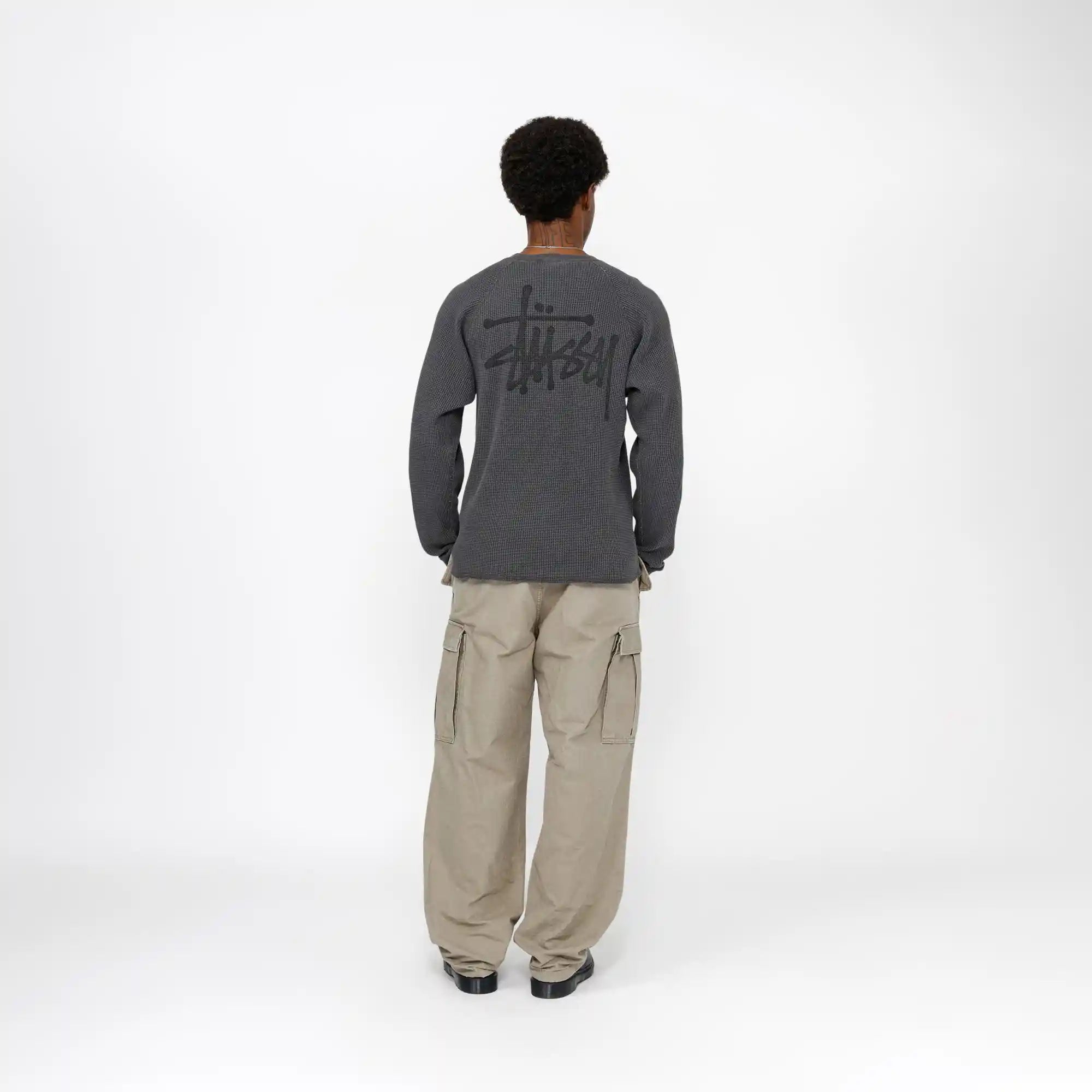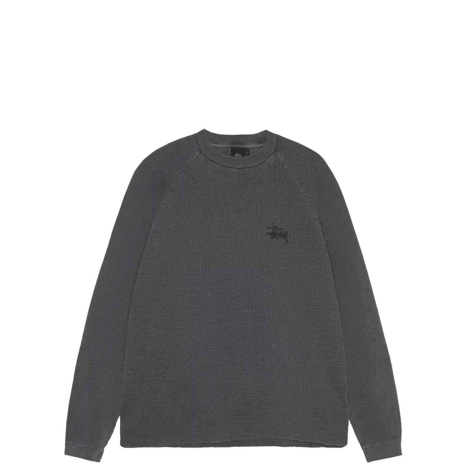 Relaxed thermal tee in acid wash waffle knit cotton. Stüssy basic stock logo printed at the left chest and across the back.