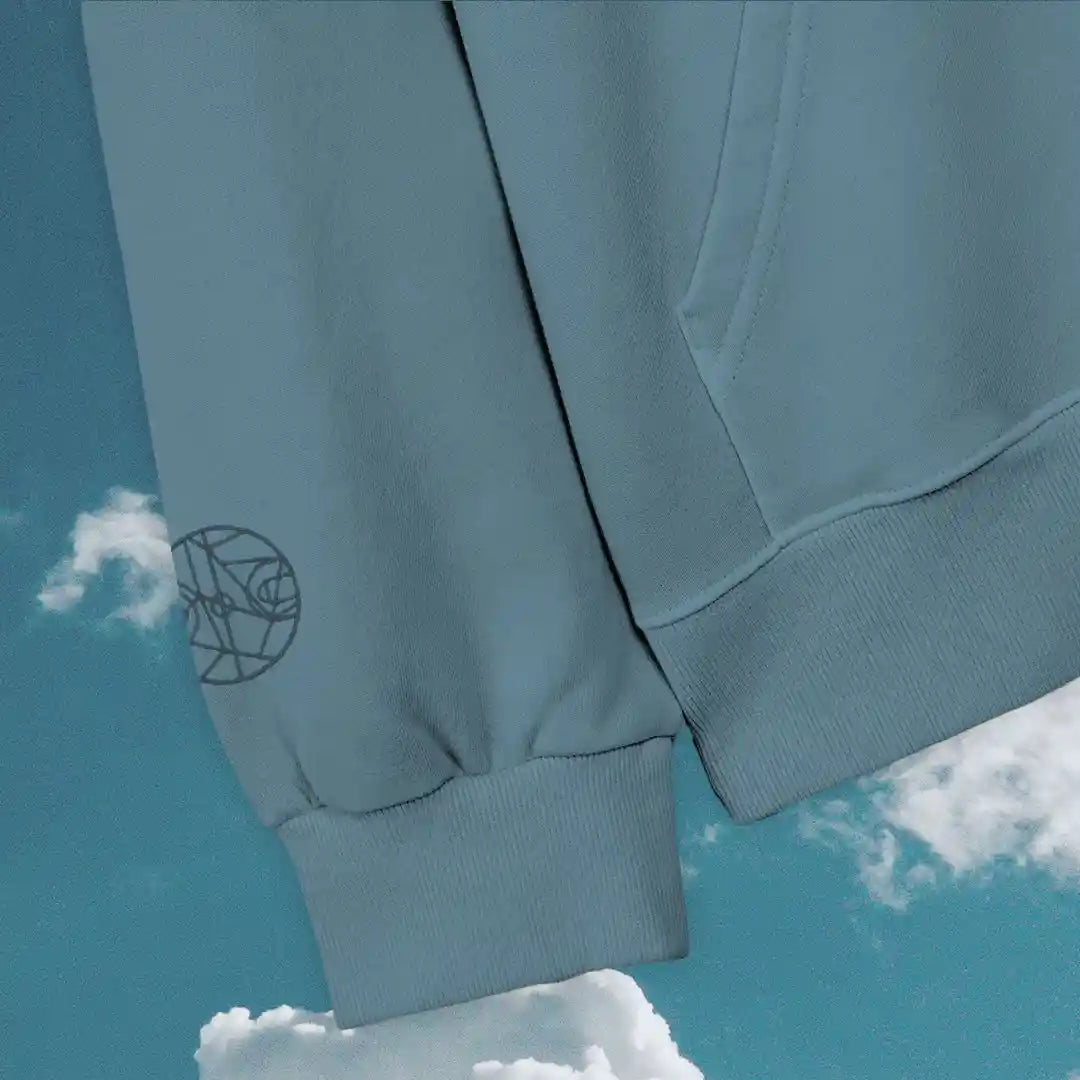 This hoodie has an oversized fit, drop shoulder, and no drawcord for a minimal appearance.
