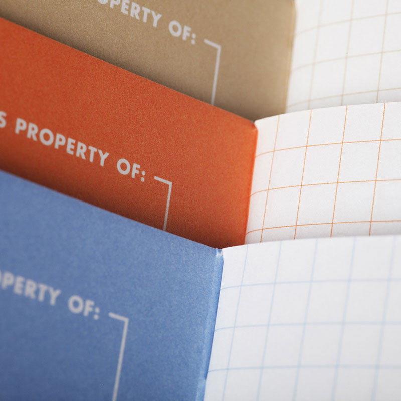 The body pages are white Finch Opaque 60#T ruled with our 3/16" graph, each featuring a different ink color matched to the inside cover. The books are bound with gold staple wire.