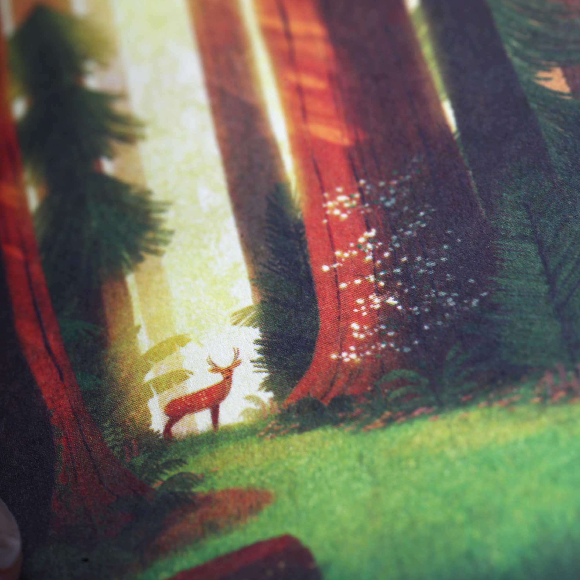 The covers are printed on a variety of coloured 100-lb. cover stocks from the French Paper Company of Niles, Michigan, using a custom, five-colour process that started with under-printing white ink. This allowed Field Notes to incorporate the colour of the paper into the artwork. The illustrative styles, the printing process, and the copper staples recall the heritage, and archival promotional materials and publications, of the National Park System.