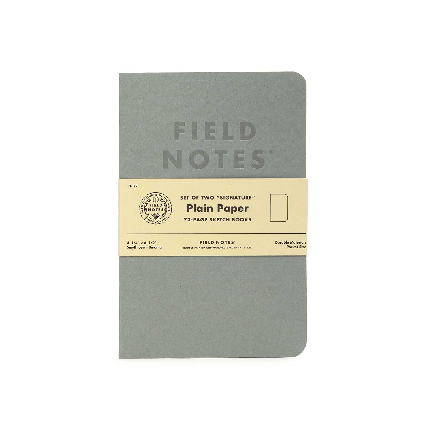 There was obvious demand, so we created this new “Signature Series” with exactly the same form and specifications as “Dime Novel.” This set is a 2-Pack of Sketch Books with blank pages and a French Paper grey/blue cover. The covers are gently debossed with just a tint of ink. We’ve used a brighter, whiter version of the same Strathmore Premium Wove stock for the 72 interior pages.