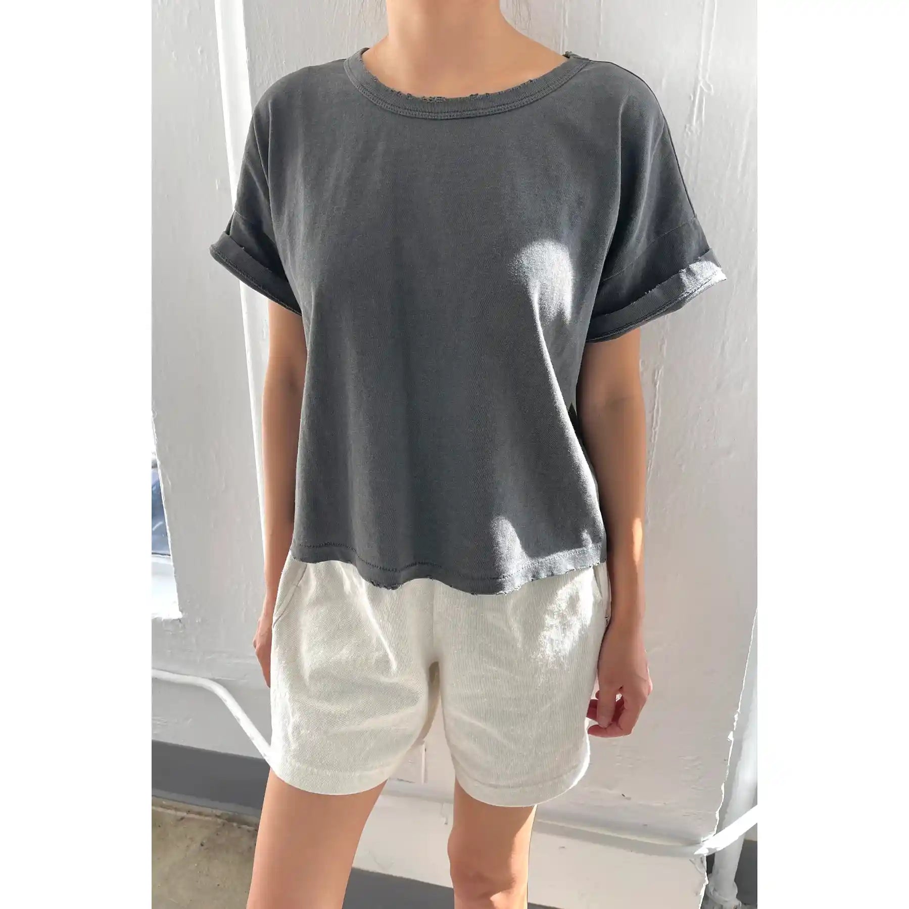 The perfect cropped but not too short tee to pair with all your high waisted bottoms is here to stay. Fille Tee is the exact length that you have been searching for in a shorter tee to wear untucked. With a light vintage distressed detail she will give you that oh so effortless look.