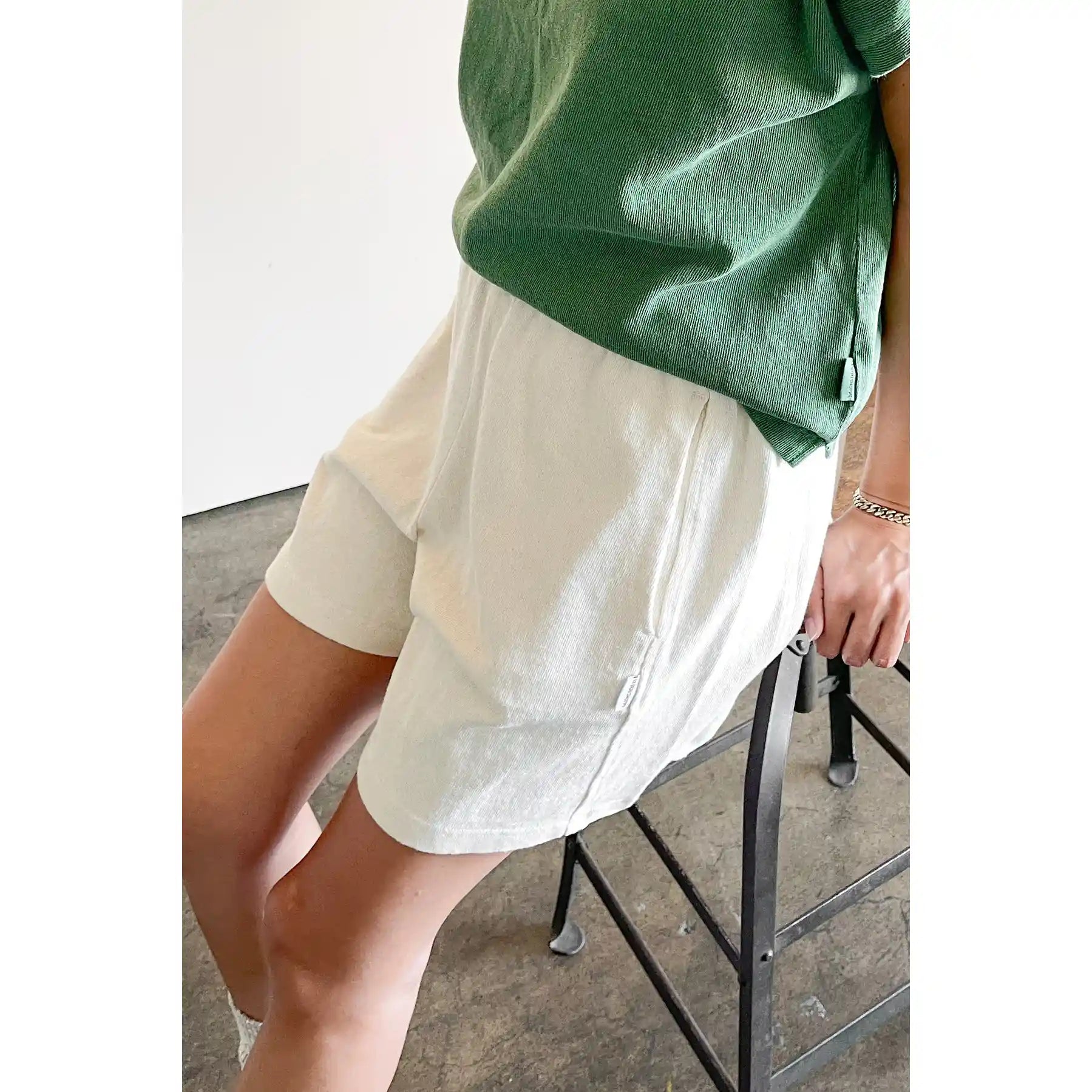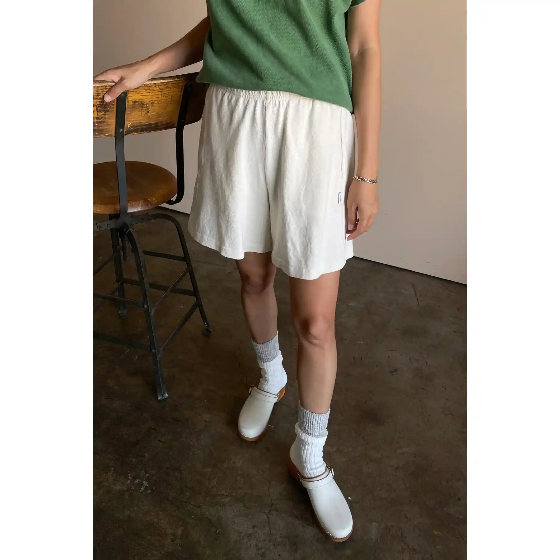 Why are most knit shorts super short, thin and tight? Le Bon Shoppe needed heavy weight knit high waisted, A-line, not showing too much skin modern retro basketball shorts! Flattering design with a slightly shorter out seam and perfect mid thigh length. This beauty is made in 100% cotton heavy weight low gauge knit. Super raw textured yet soft and airy! She is garment dyed and pre-washed for a rich textured look with an ultra soft hand.