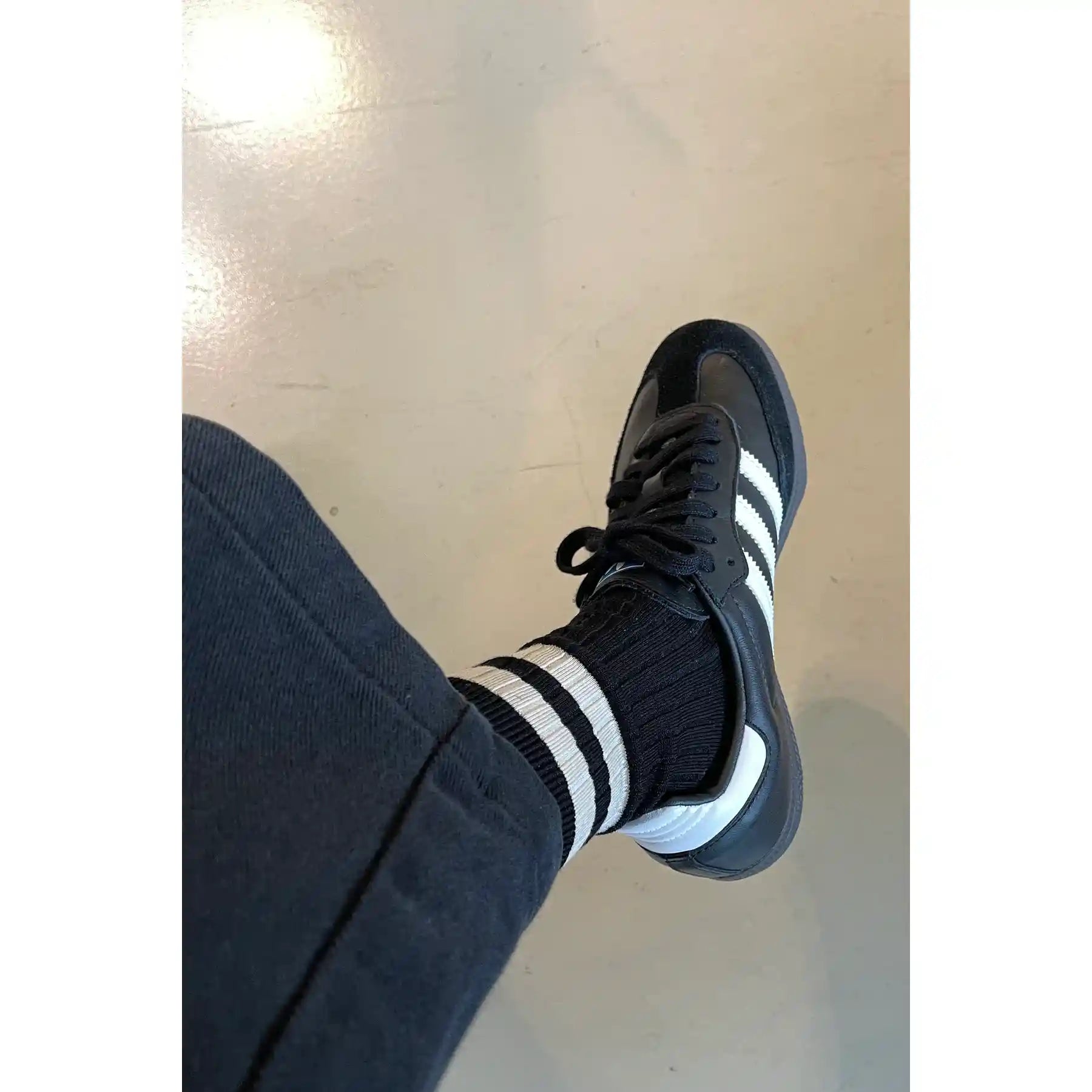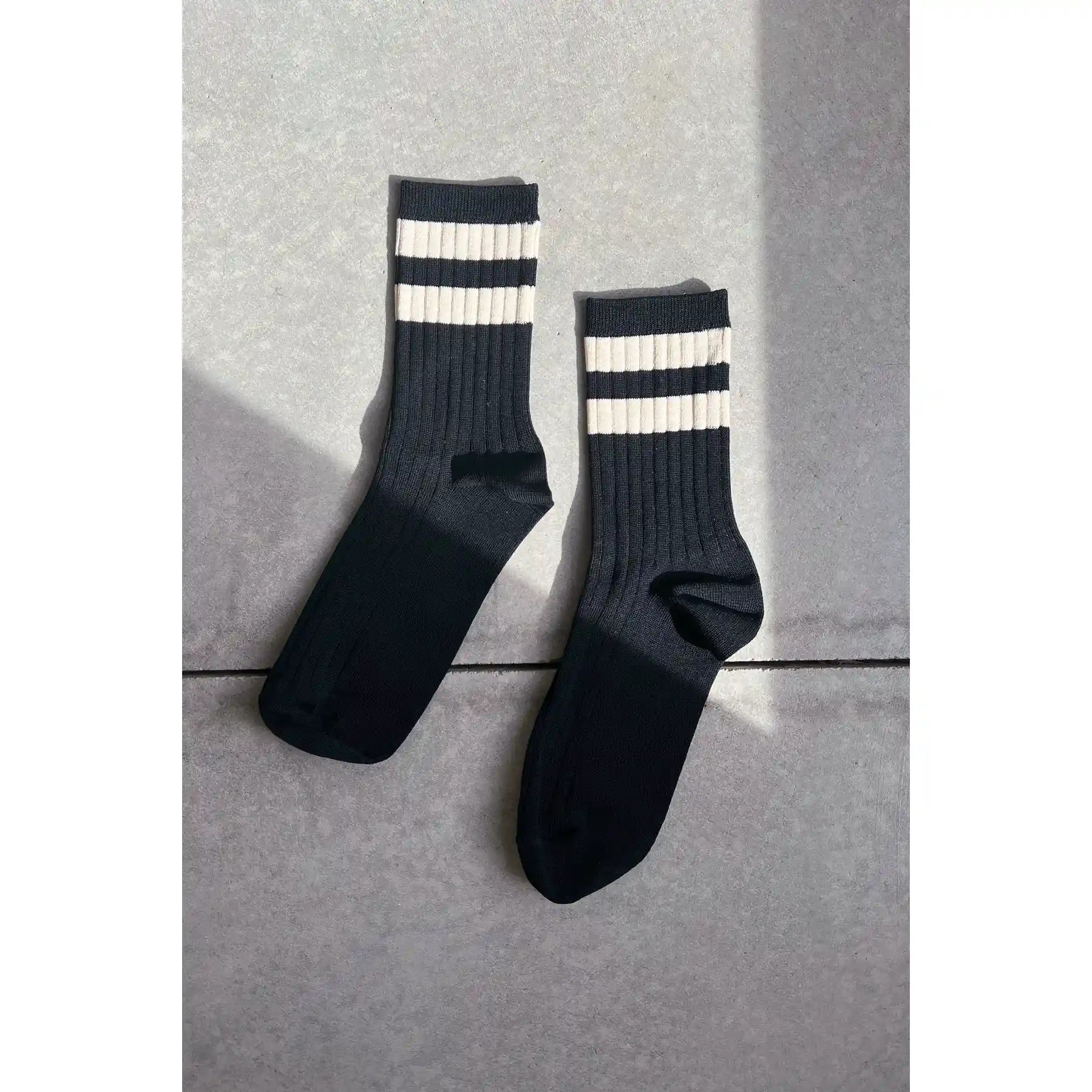 A bold varsity stripe is timeless and always a classic. Her Varsity Socks is a varsity striped version of Le Bon's OG Her Socks which are classically ribbed, perfect height, cotton blend durable, chic go to socks. Add an understated sporty touch to any look with this bold stripe contrast version of Her Socks. She loves to be worn with a mini skirt, plaids, and oversized cable knit sweaters.