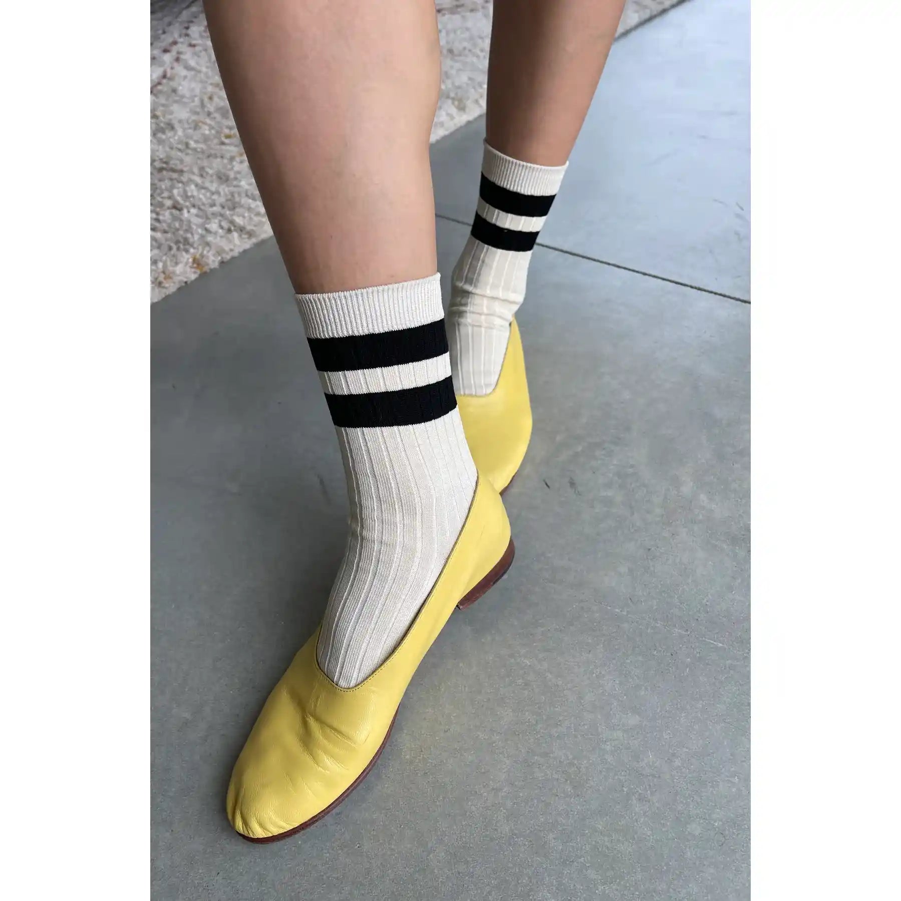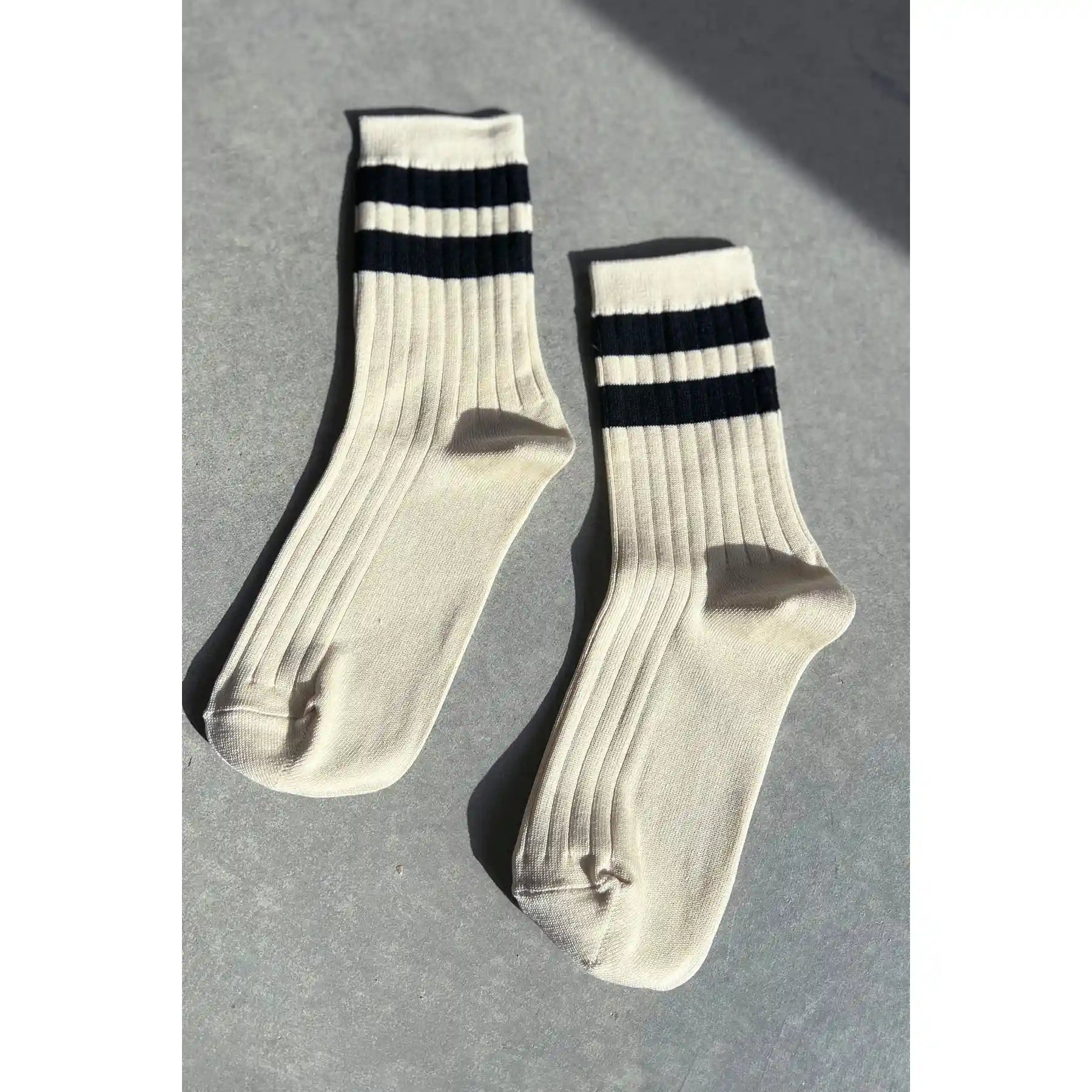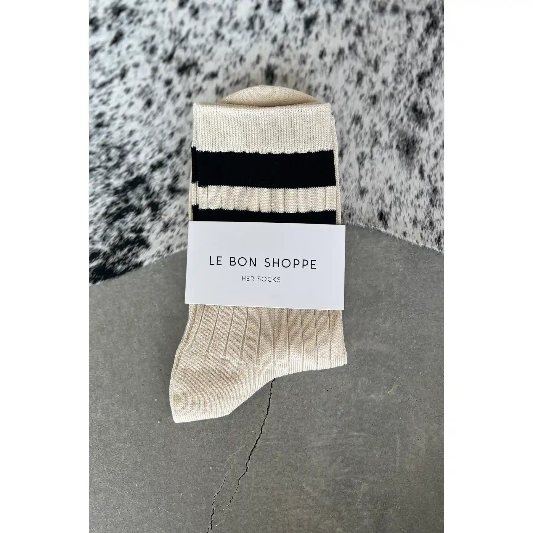 A bold varsity stripe is timeless and always a classic. Her Varsity Socks is a varsity striped version of Le Bon's OG Her Socks which are classically ribbed, perfect height, cotton blend durable, chic go to socks. Add an understated sporty touch to any look with this bold stripe contrast version of Her Socks. She loves to be worn with a mini skirt, plaids, and oversized cable knit sweaters.