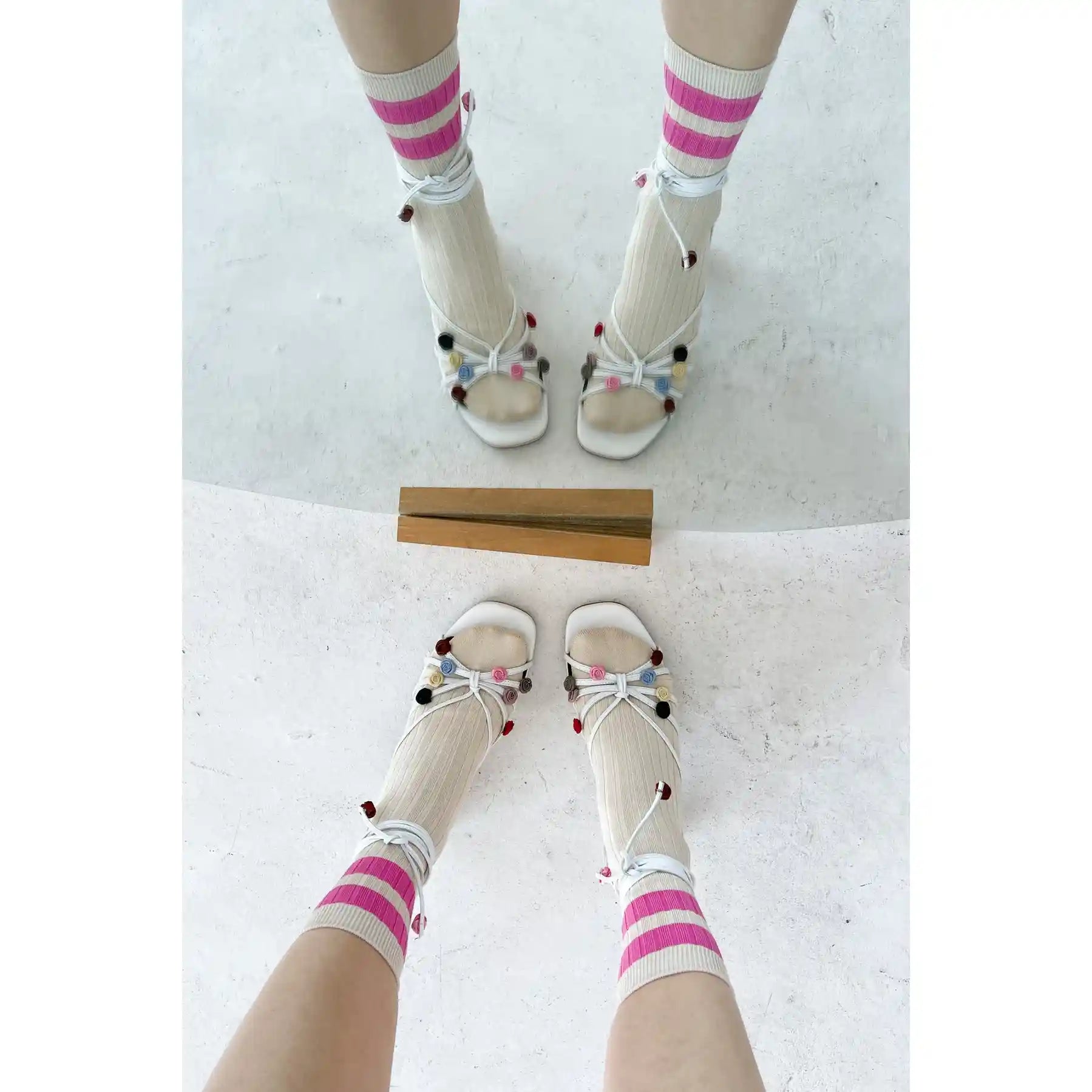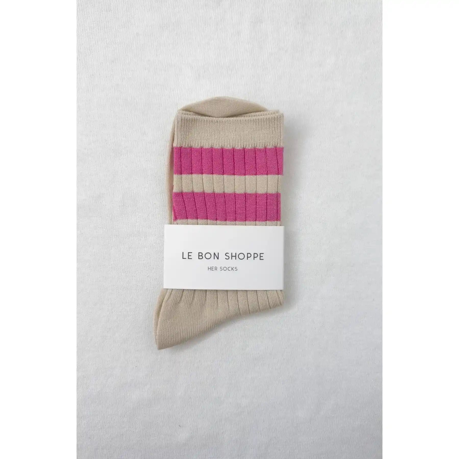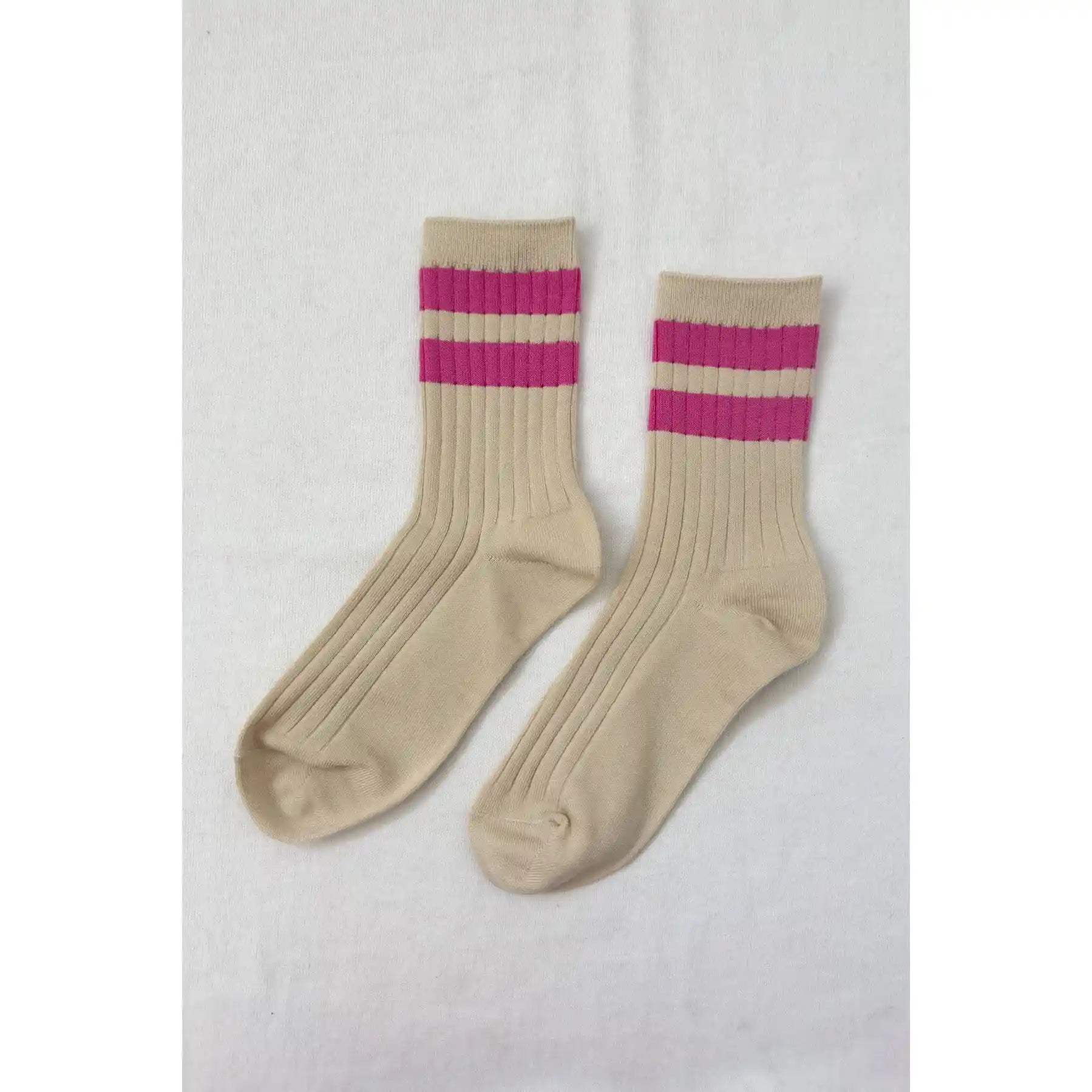 A bold varsity stripe is timeless and always a classic. Her Varsity Socks is a varsity striped version of Le Bon's OG Her Socks which are classically ribbed, perfect height, cotton blend durable, chic go to socks. Add an understated sporty touch to any look with this bold stripe contrast version of Her Socks. She loves to be worn with a mini skirt, plaids, and oversized cable knit sweaters.