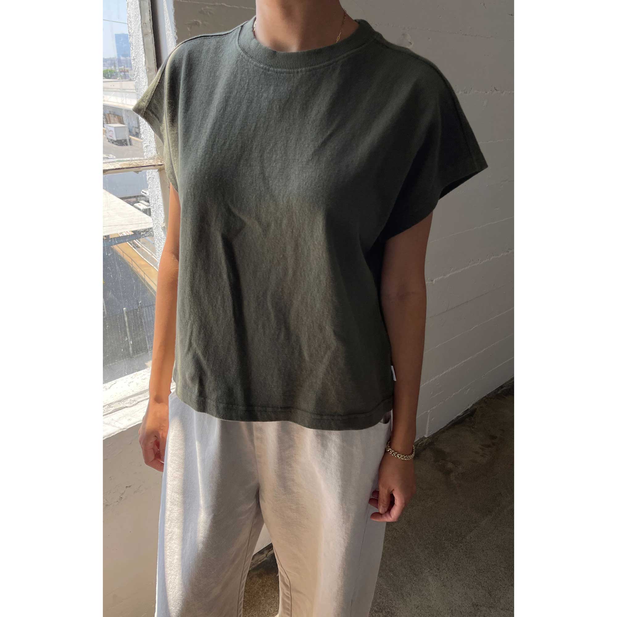 Jeanne Tee is the perfect muscle tee. She features a shorter length to pair perfectly with high waisted bottoms but still give enough coverage for mid-rise bottoms and just the right amount of off shoulder dolman sleeve. She has a high crew neck with an extra wide neckband that adds to her signature charm.