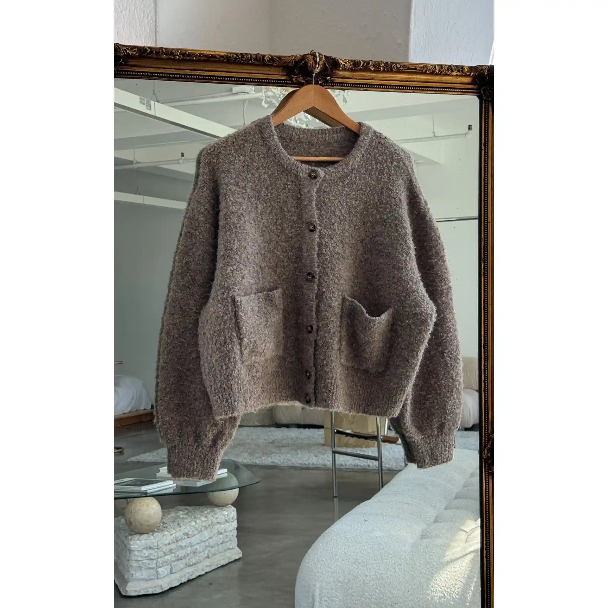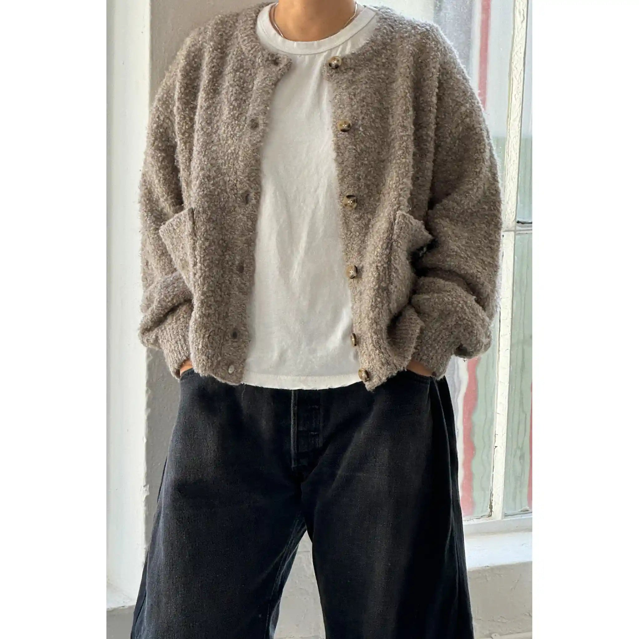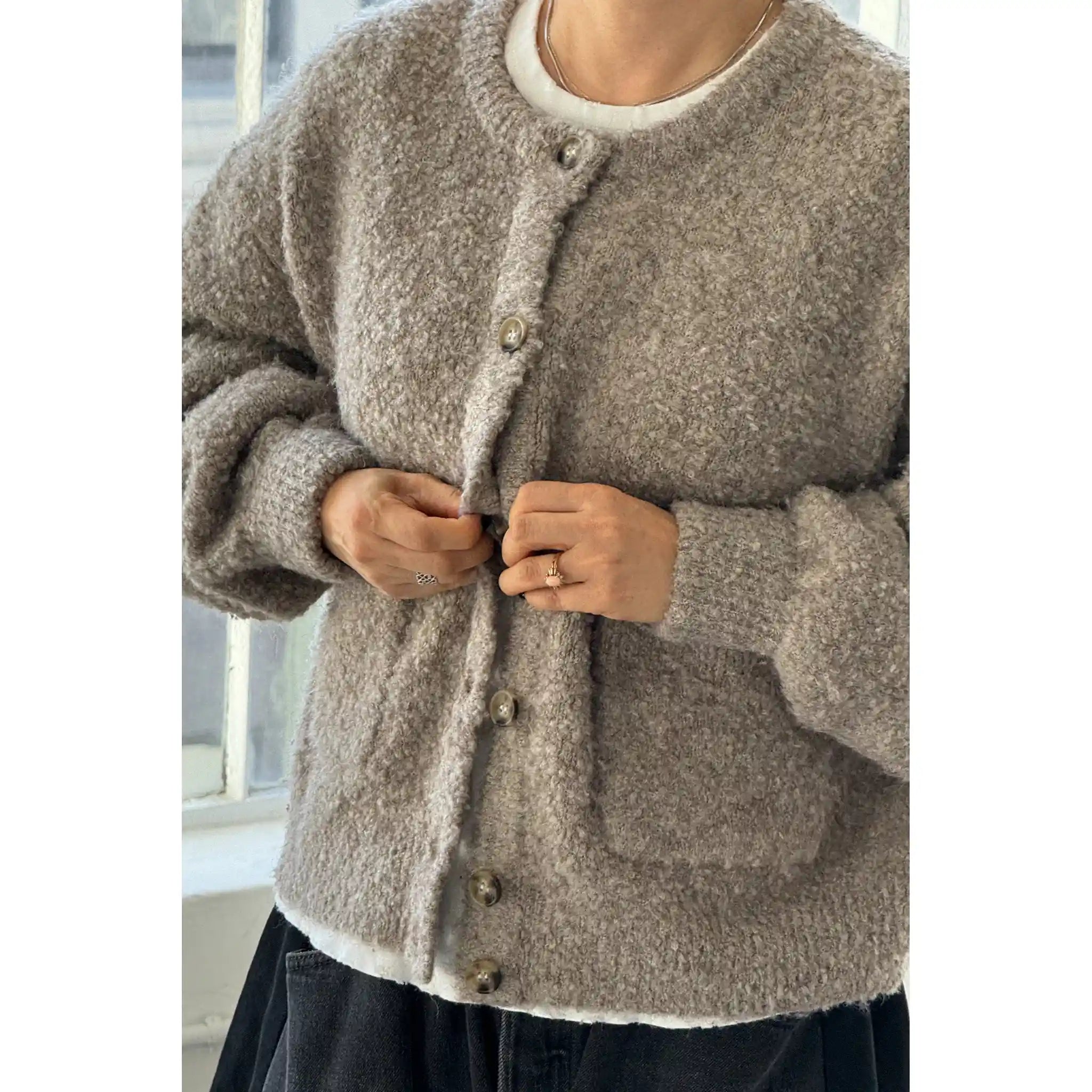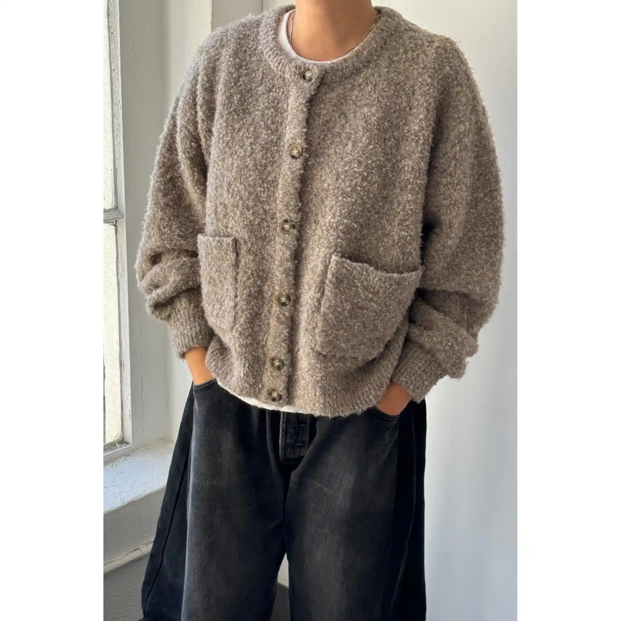 Stay cozy in the Millie Cardigan, a slightly oversized sweater that delivers the perfect lived-in look. With a timeless button-front design and handy front patch pockets, it’s both stylish and functional. Made from the same wool-blend boucle yarn as the Louie and Andre Sweaters, it’s warm, comfortable, and adds a classic touch to any outfit.