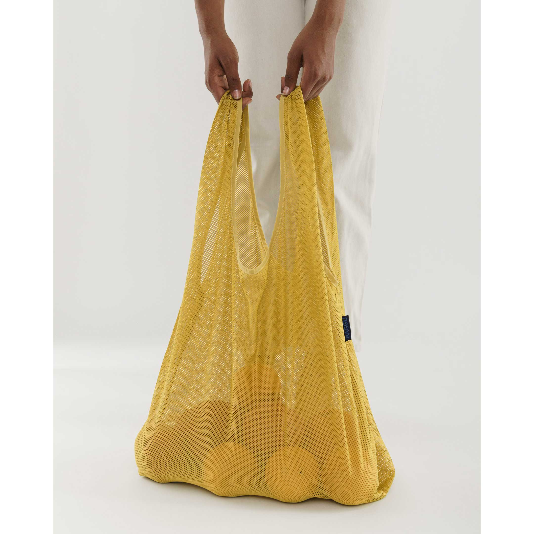 Say hello to the Mesh Baggu: a reusable bag made entirely from recycled plastic bottles. It's just as packable, versatile, and easy to take along as the Standard Baggu, but make no mistake, it’s its own bag. Perfect for trips to the beach, water and sand slip right through.