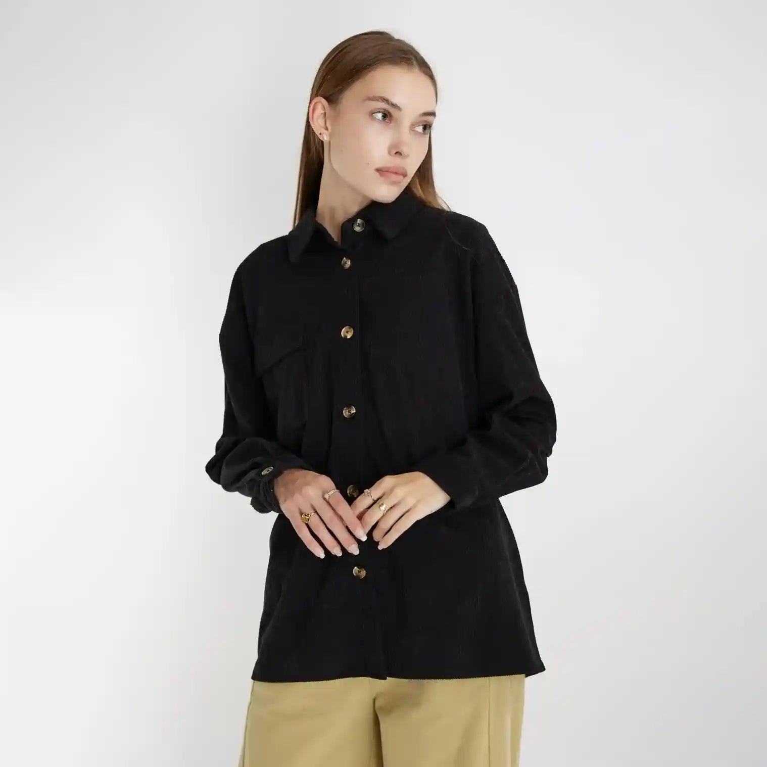 This oversized shirt is cut from a lightweight, but durable corduroy fabric, made to layer with your outfits this season and into the next. It has a single front patch pocket and button down closure. Pair yours with shorts for a cool and casual summer look.