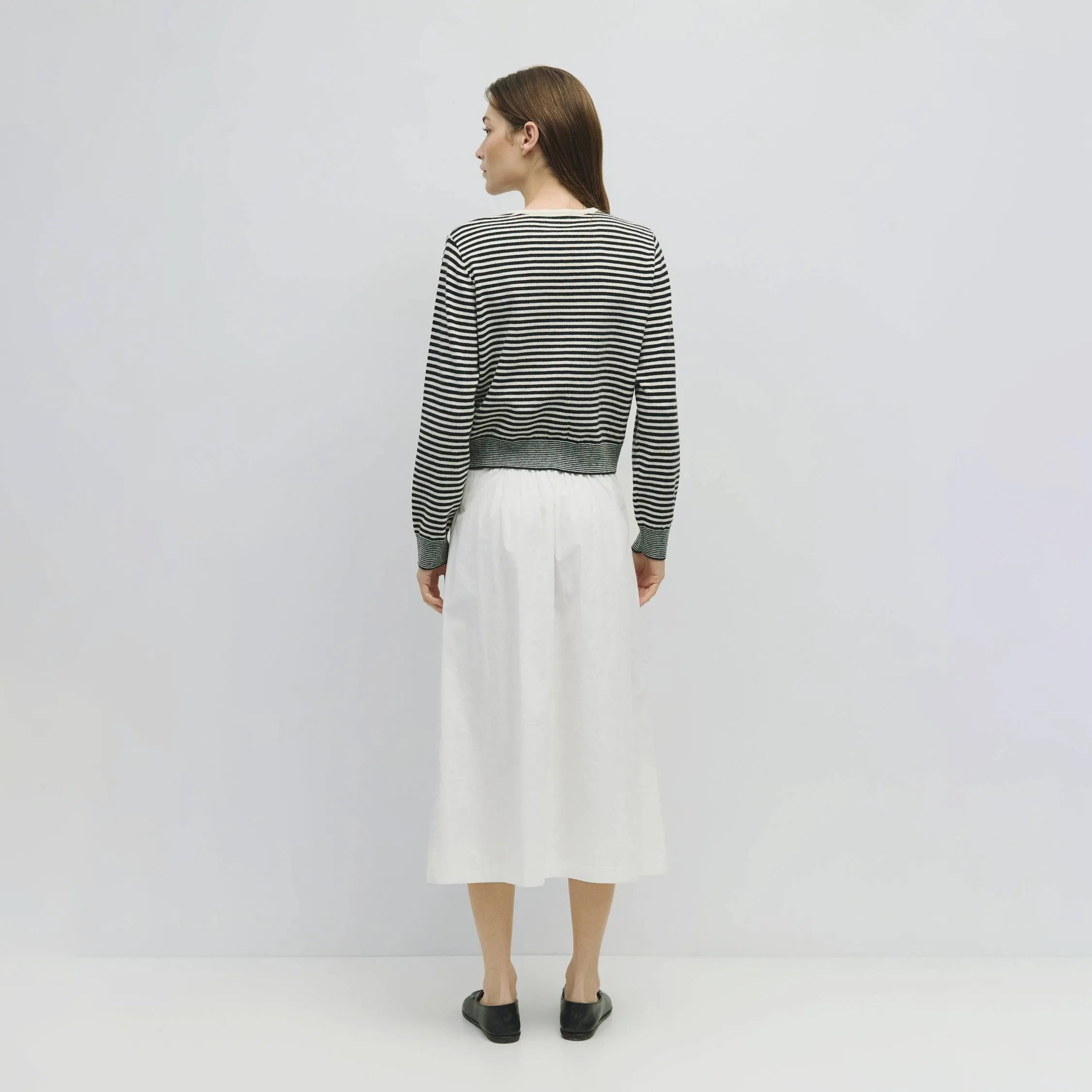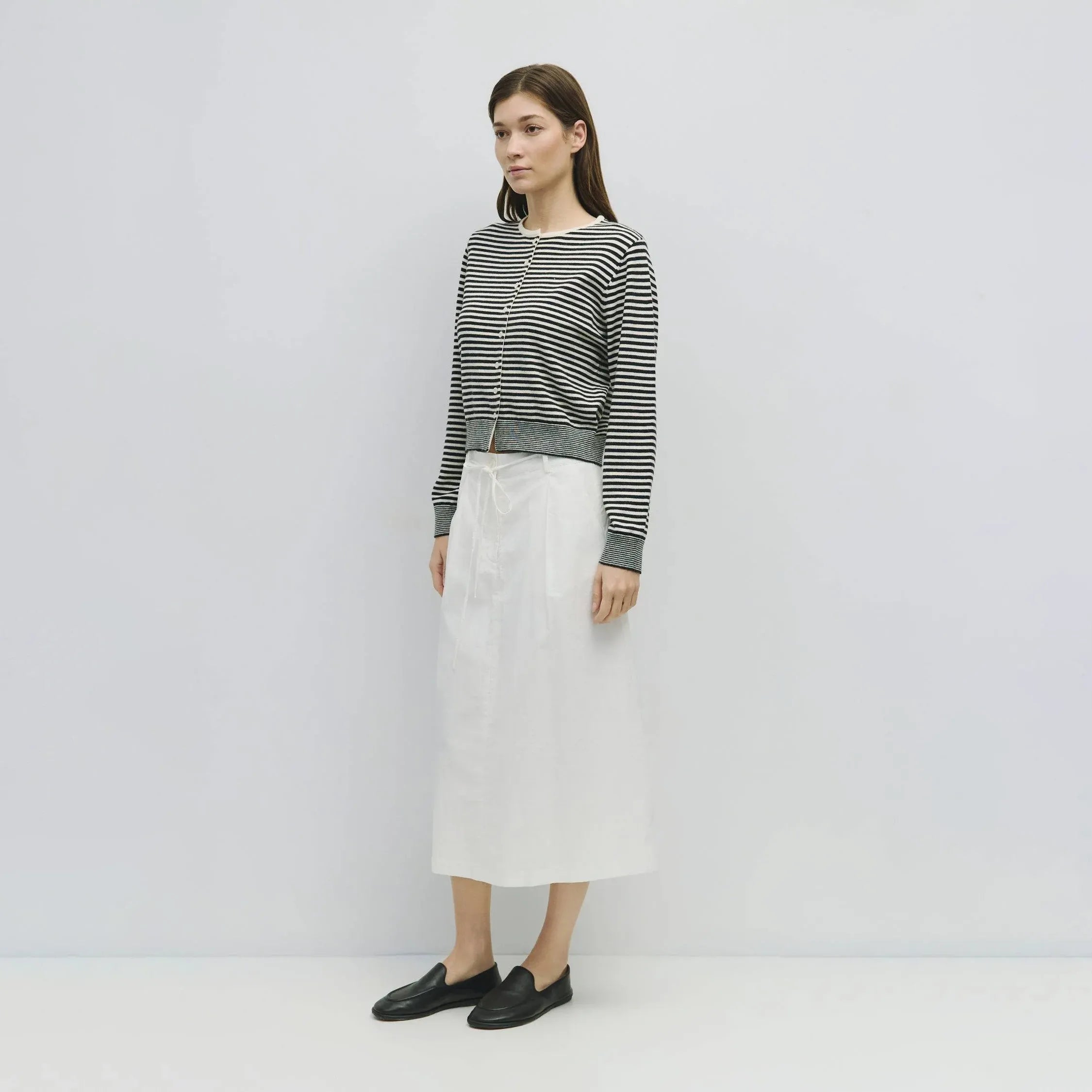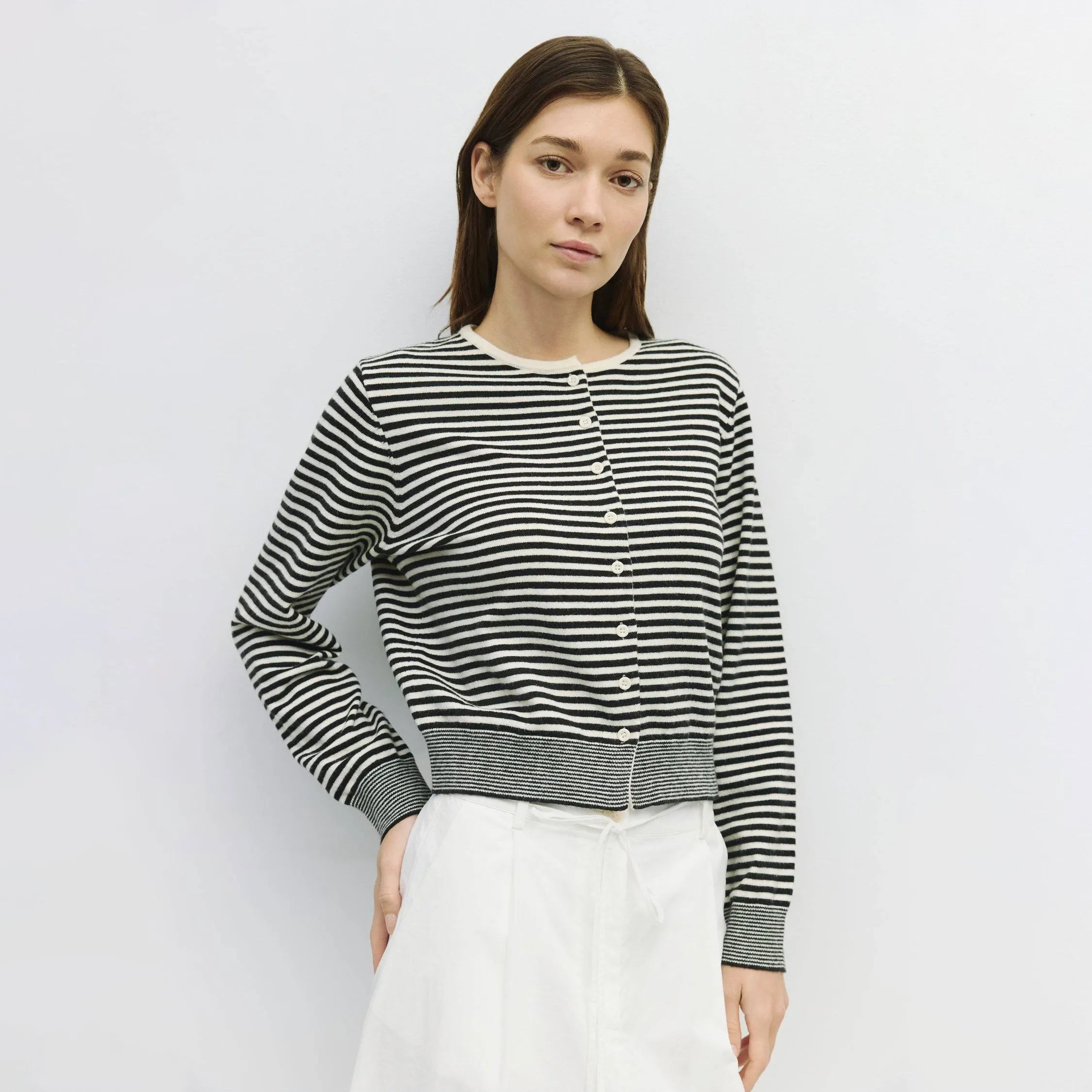 The Montana Cardigan is a lightweight, long-sleeve stripe knit cardigan with a relaxed fit, button-down closure, and a subtle front bottom slit.