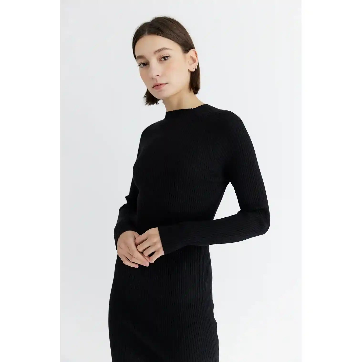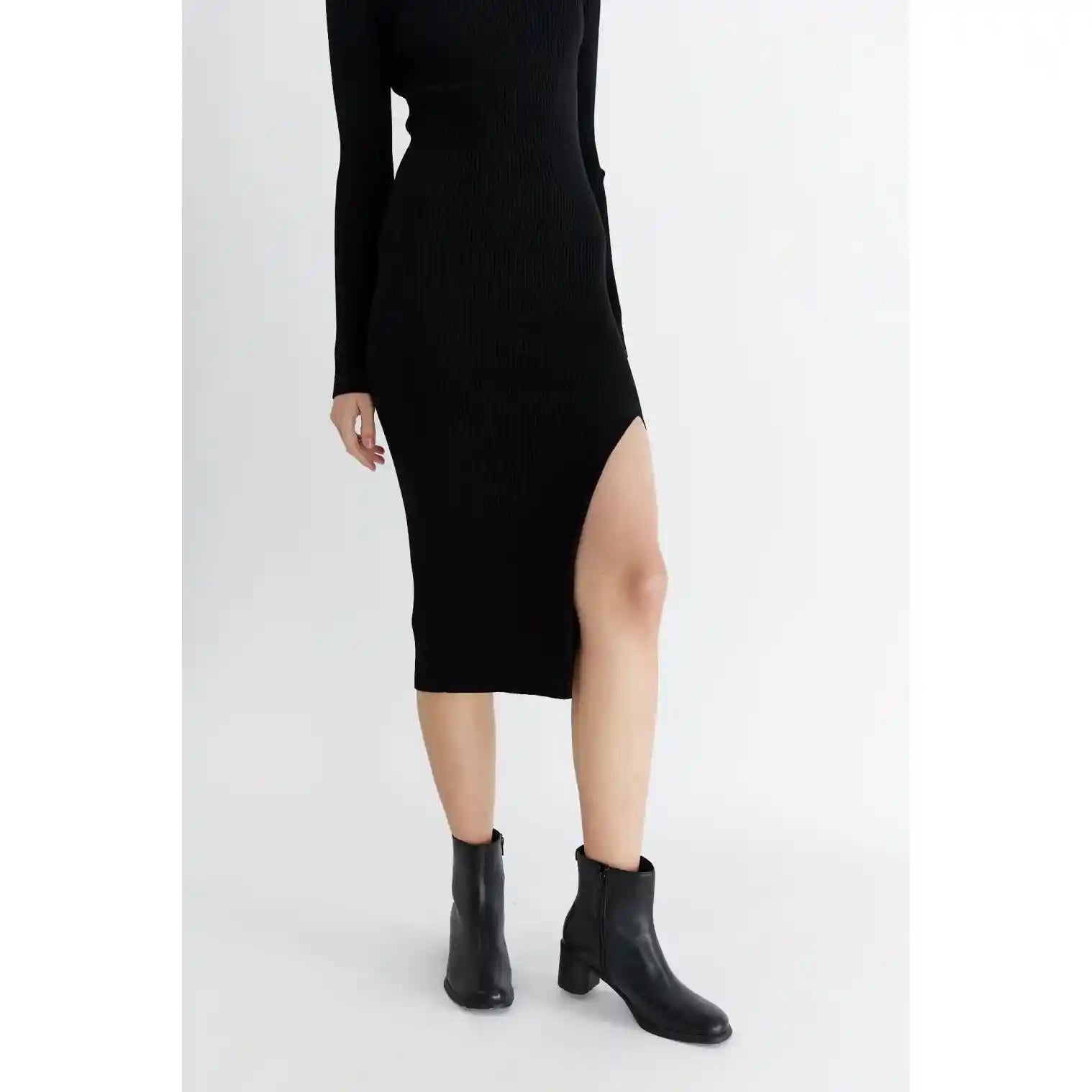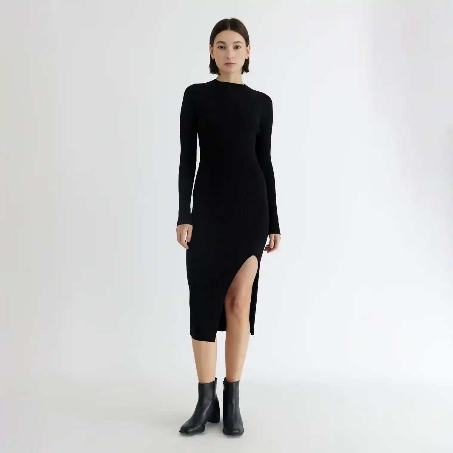 This irie dress is a great choice for a foundation piece. Crafted from a stretchy rib-knit fabrication, this dress will hug your body in the right places. It features a mid-length, high neckline and a front slit.