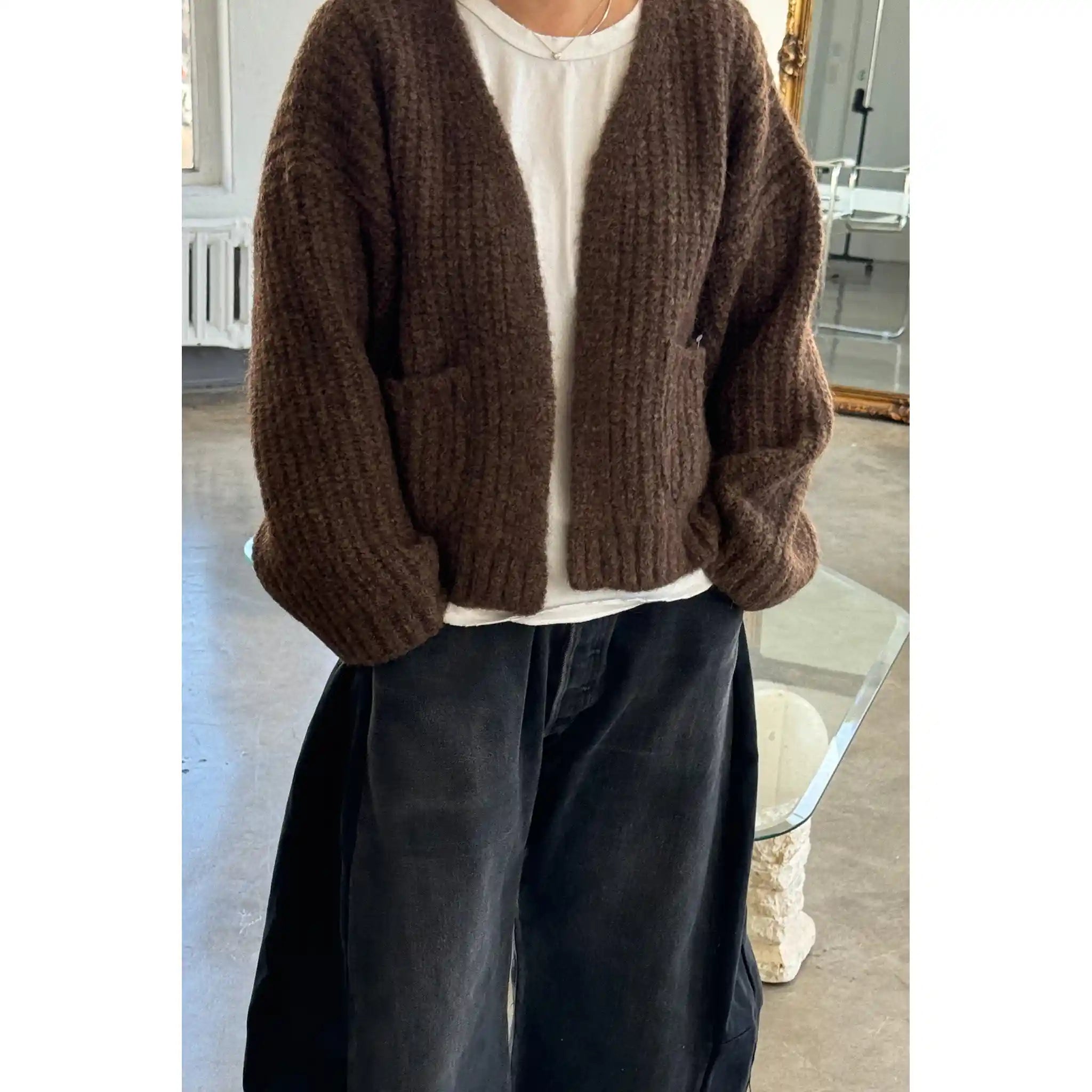 The Alpaca Sweater Jacket delivers the warmth and comfort of a cozy bear hug in a fresh, modern take on the open-front cardigan. For those who loved the Grandpa Alpaca Vest, this sweater is a perfect match. Crafted from a soft alpaca-blend yarn, it features a relaxed fit with a flattering cropped length. Ideal for layering over tees or under heavier coats, it's the ultimate versatile piece for staying cozy during cooler months.