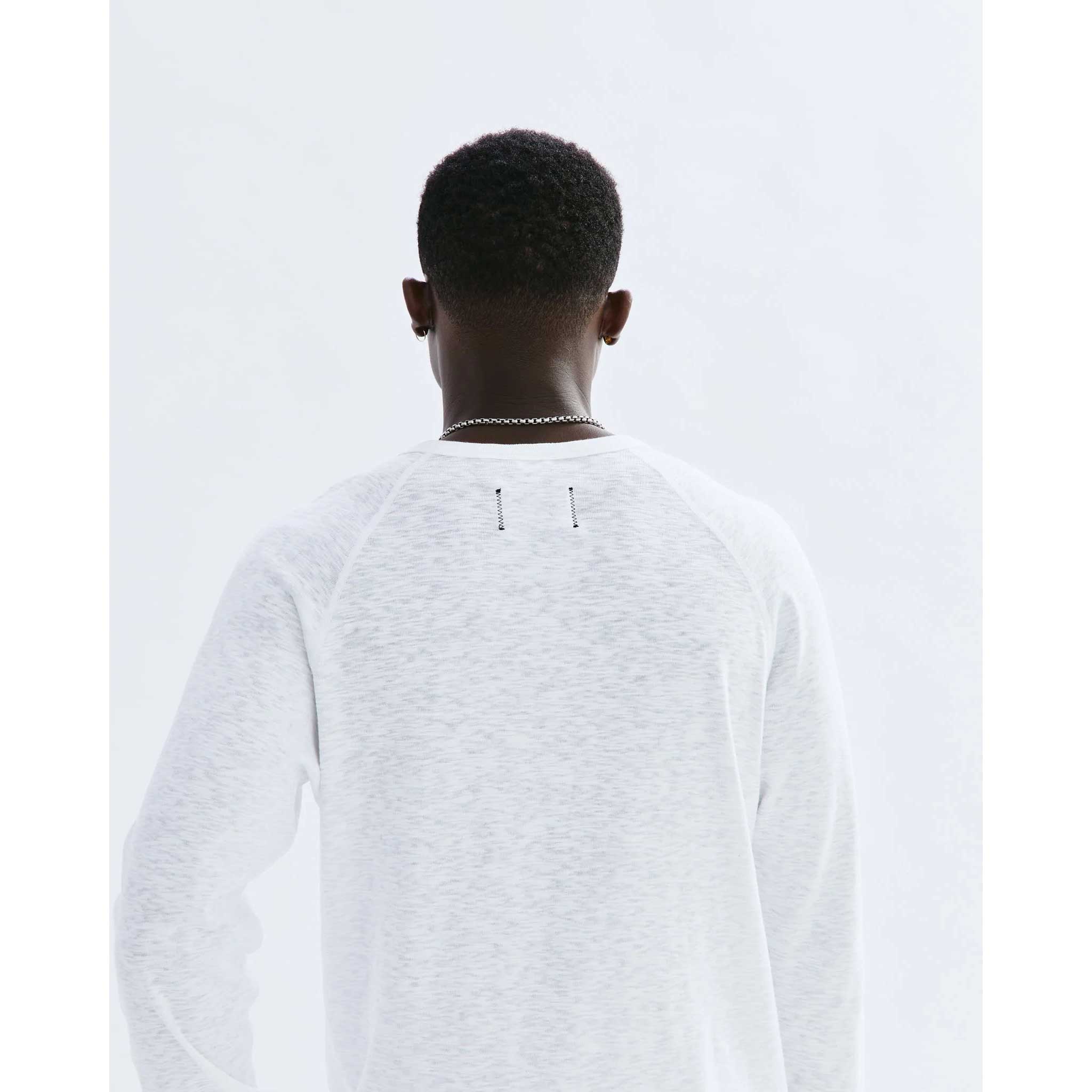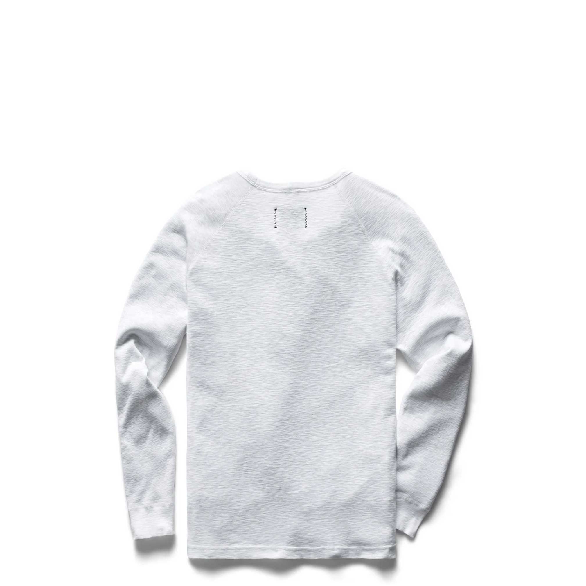 A long sleeve T-shirt made with custom-developed 1x1 slub rib cotton. Designed with a semi-raglan sleeves, self-fabric collar and cuffs, and an athletic trim fit.