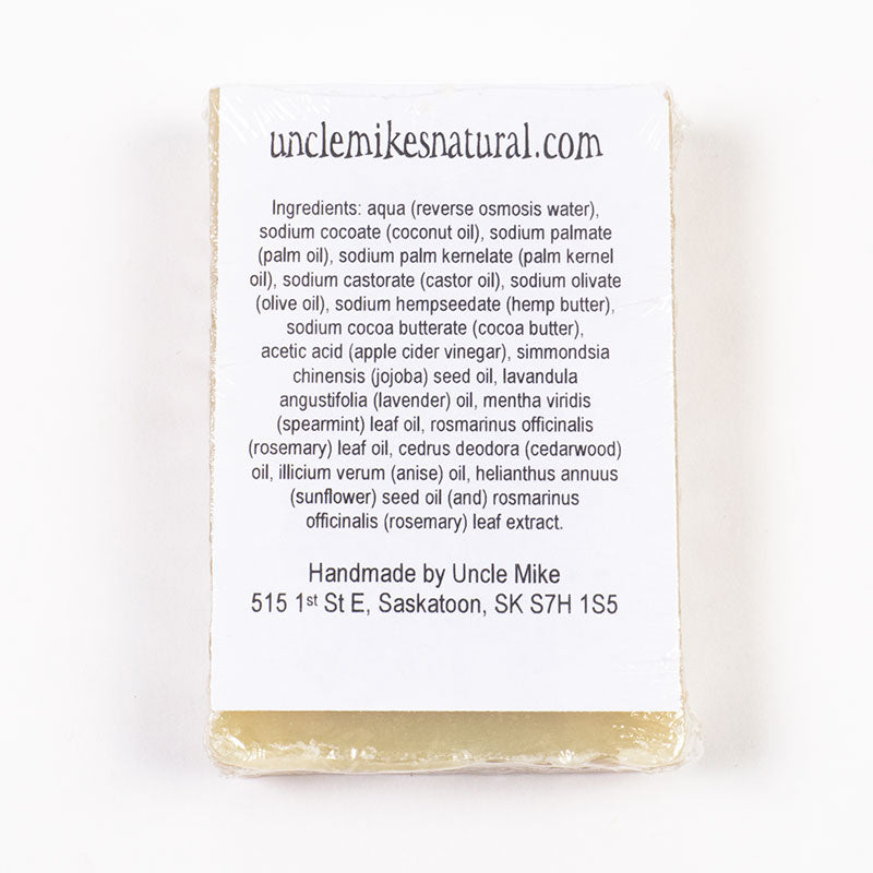 aqua (reverse osmosis water), sodium cocoate (coconut oil), sodium palmate* (palm oil), sodium palm kernelate* (palm kernel oil), sodium castorate (castor oil), sodium olivate (olive oil), sodium hempseedate (hempseed oil), sodium cocoa butterate (cocoa butter), acetic acid (apple cider vinegar), simmondsia chinensis (jojoba oil), lavandula angustifolia (lavender) oil, mentha viridis (spearmint) leaf oil, rosmarinus officinalis (rosemary) leaf oil, cedrus deodora (cedarwood) oil, illicium verum (anise) oil, helianthus annuus (sunflower) seed oil (and) rosmarinus officinalis (rosemary) leaf extract