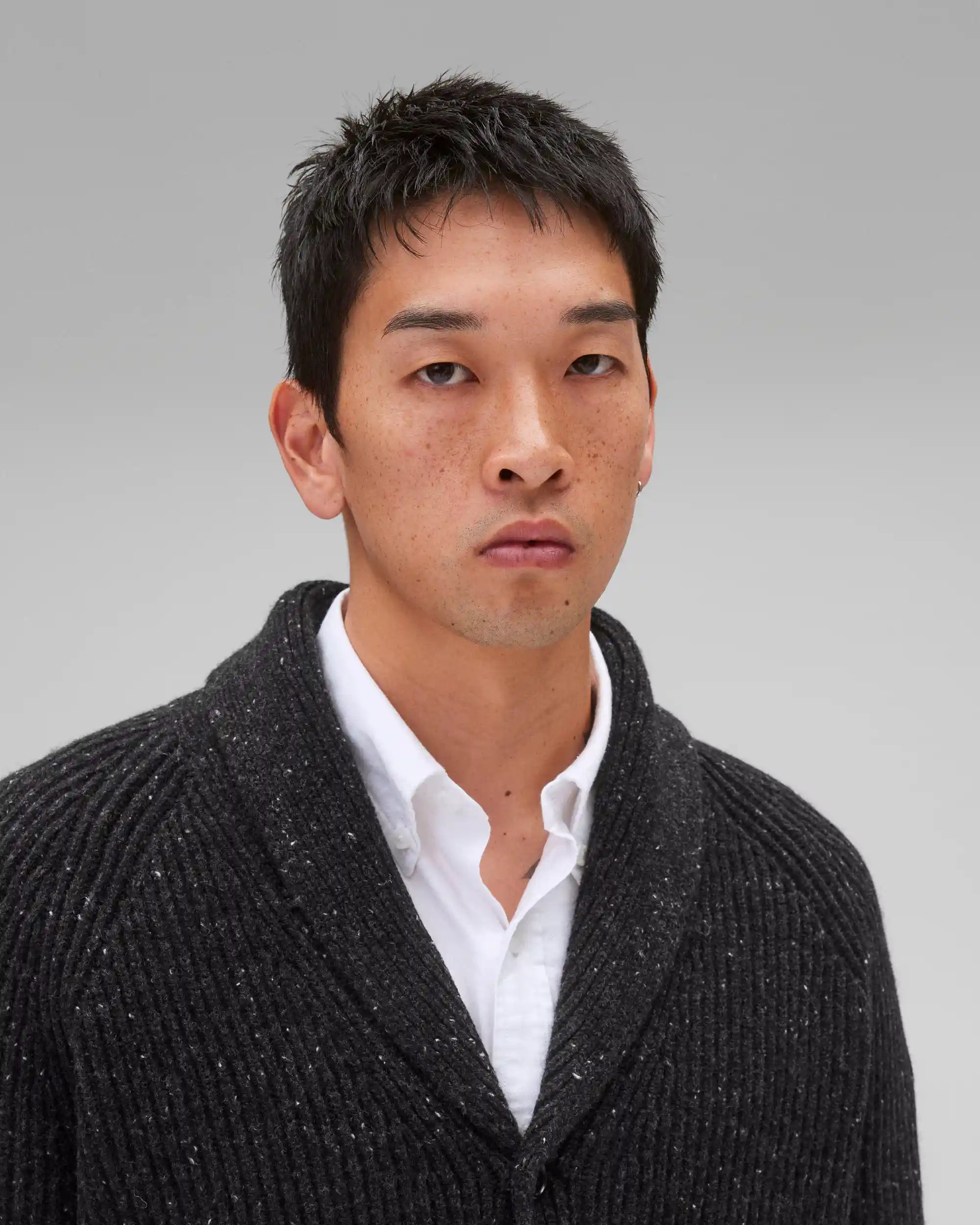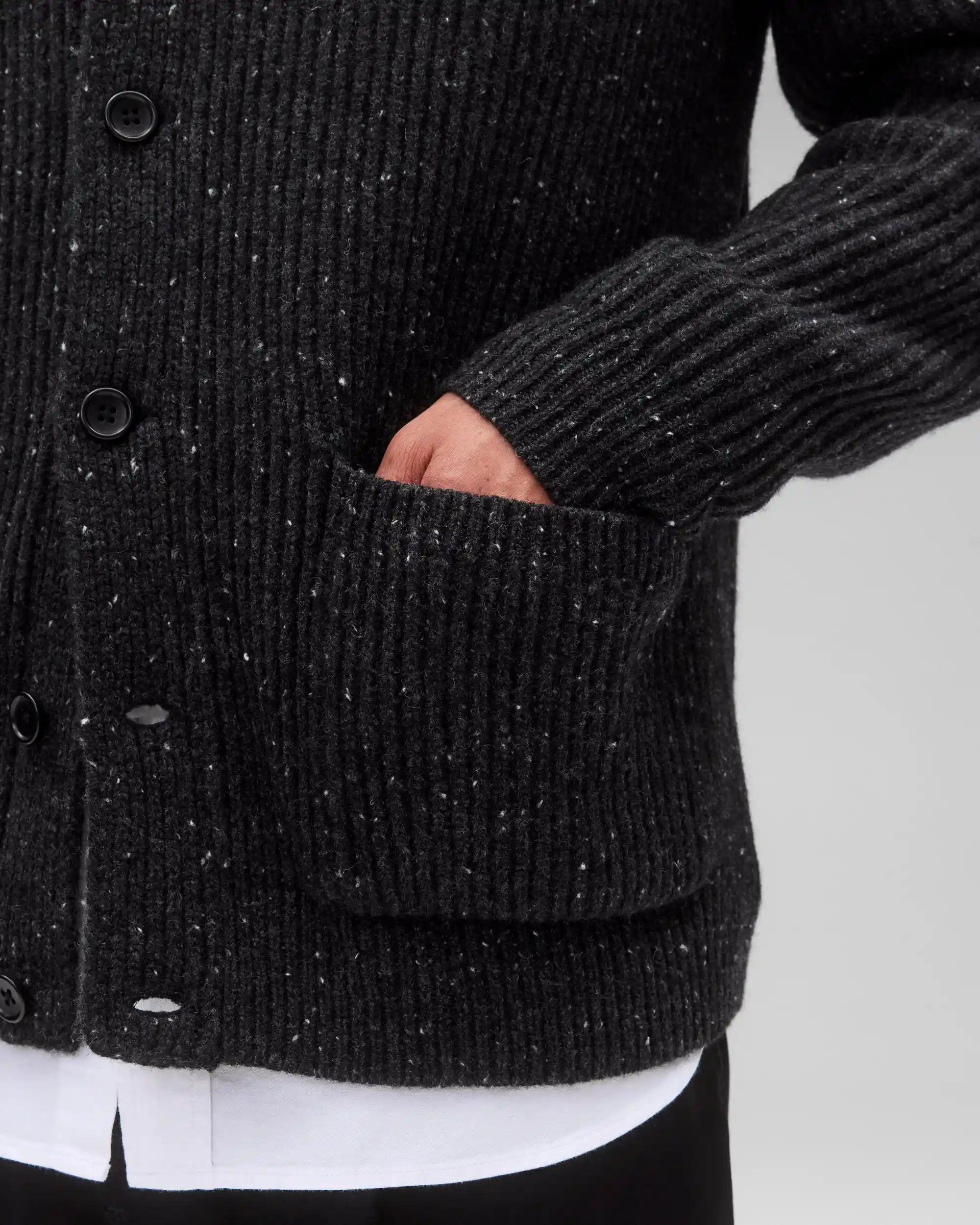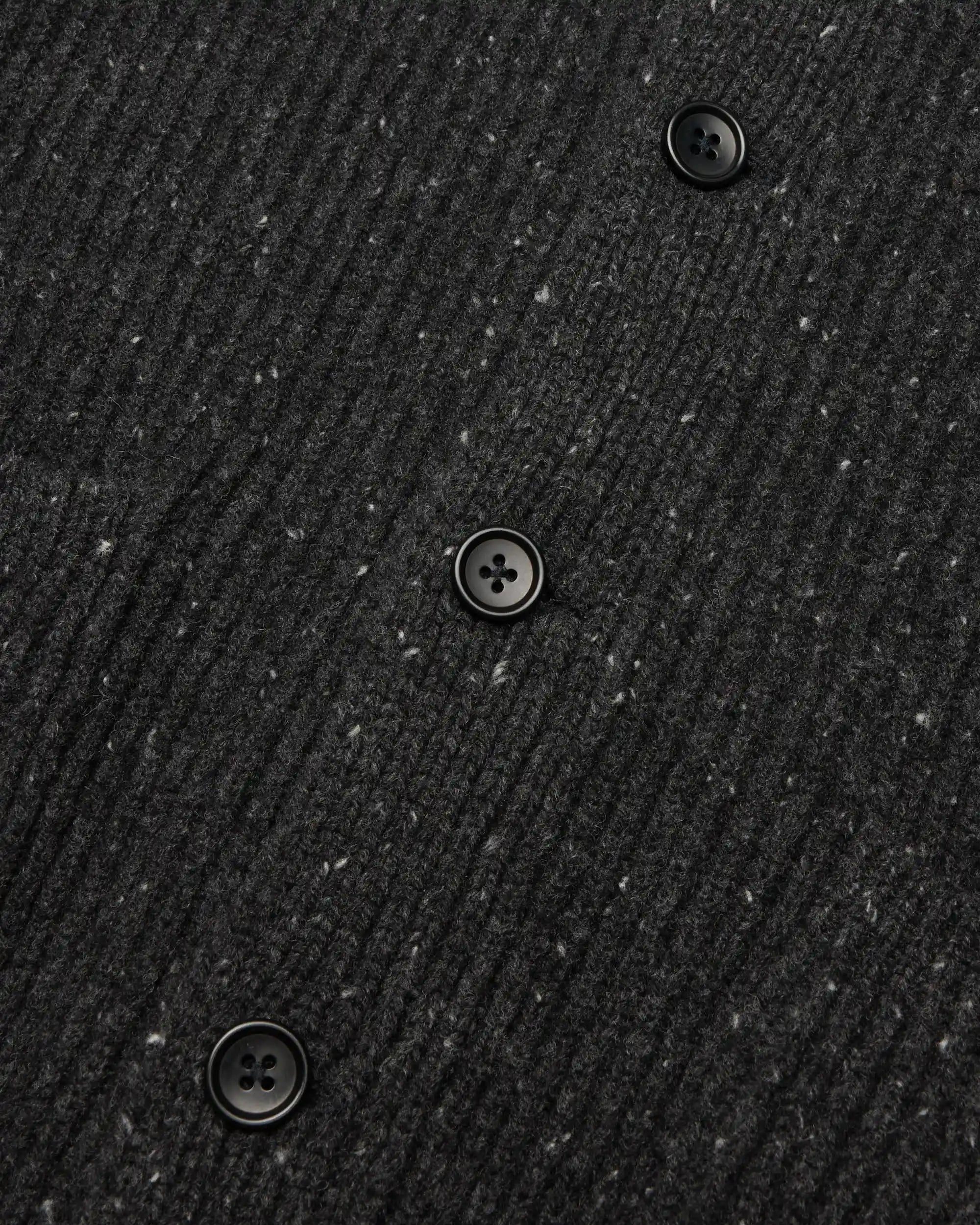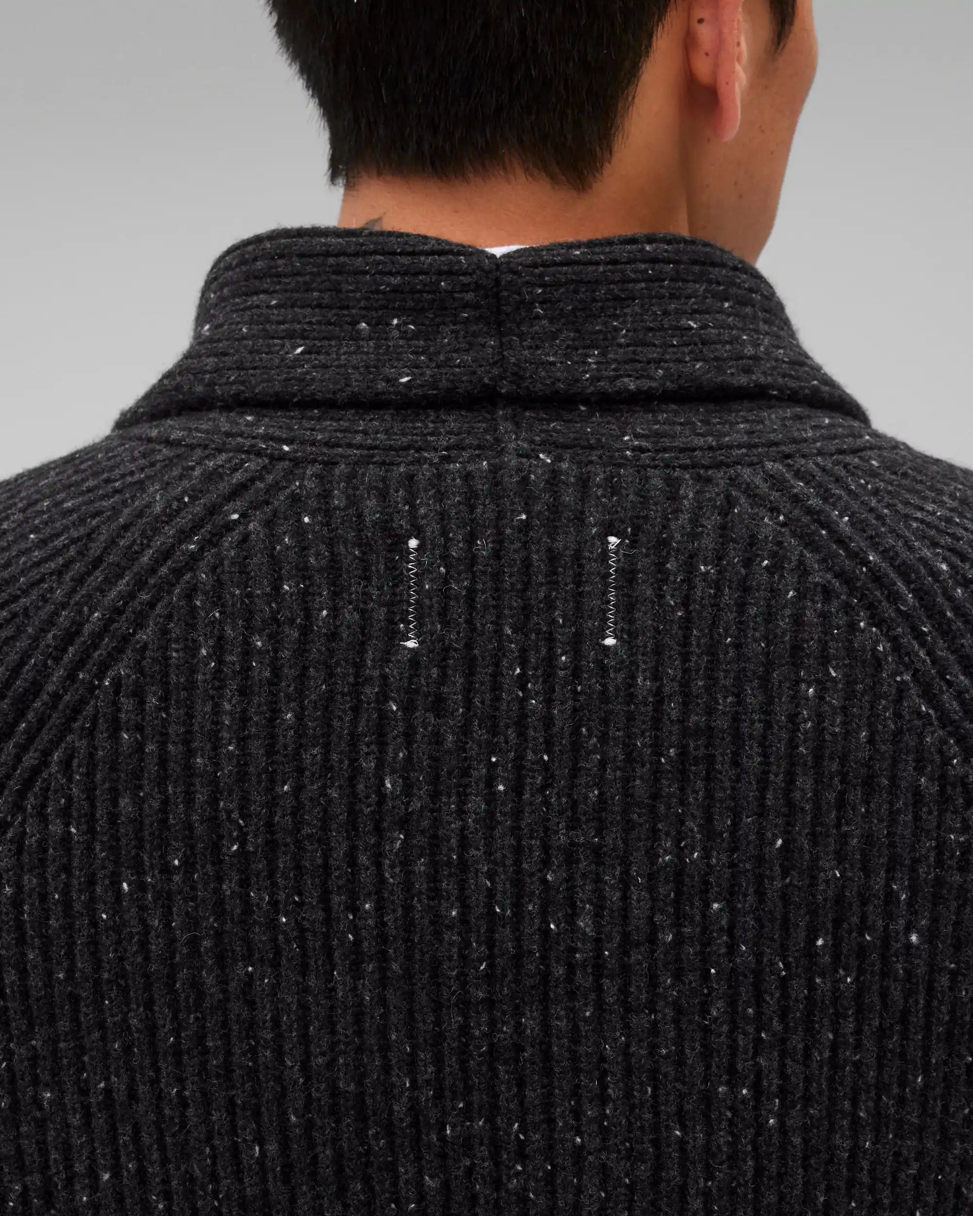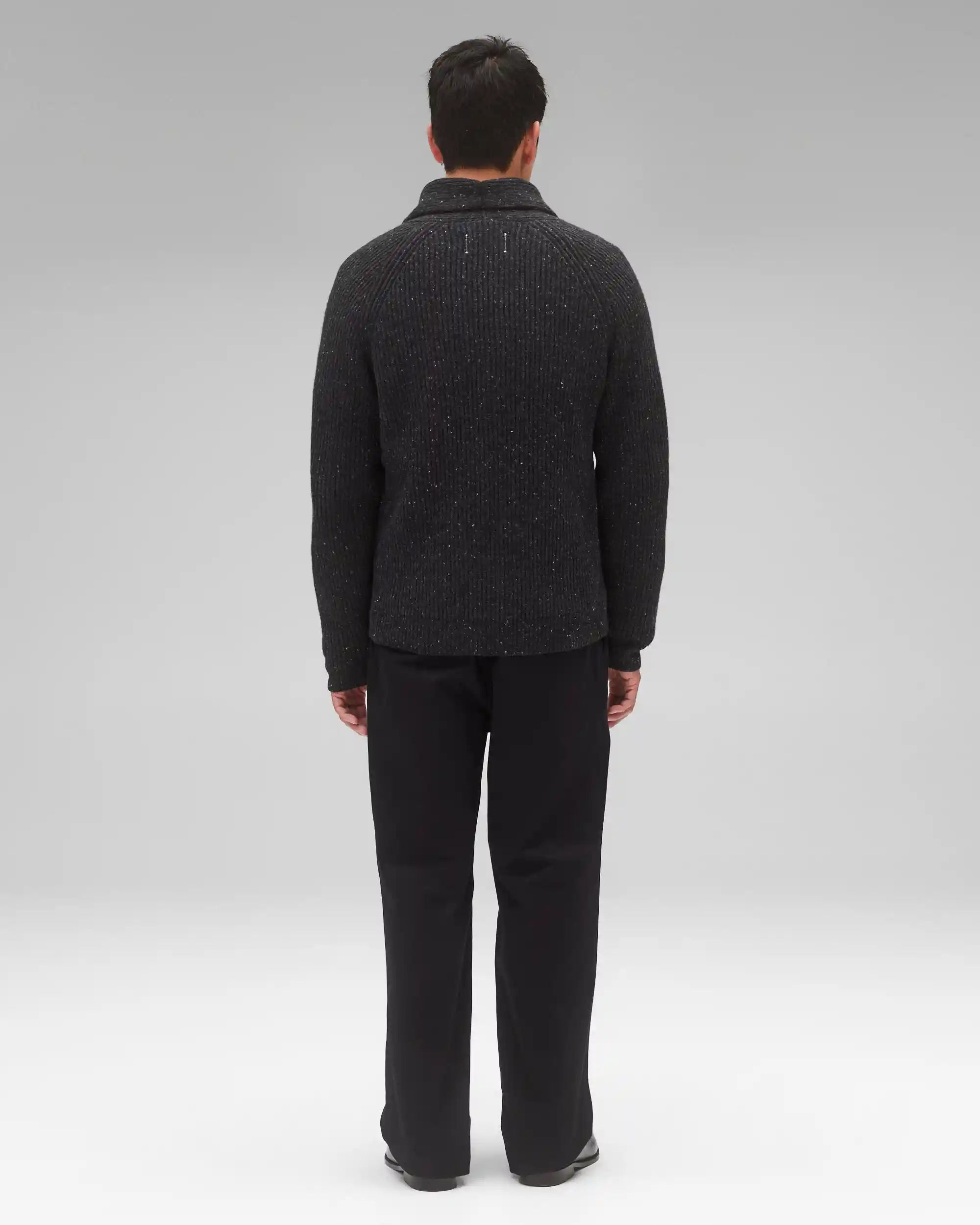 This knitted cardigan is crafted from nep merino wool, featuring small knots or clusters to impart distinctive character and feel. Constructed in a standard fit, with fully fashioned seams. Designed with a knit shawl collar and placket, corozo buttons, raglan sleeves, patch pockets, side gussets, and rib knit cuffs and hem.