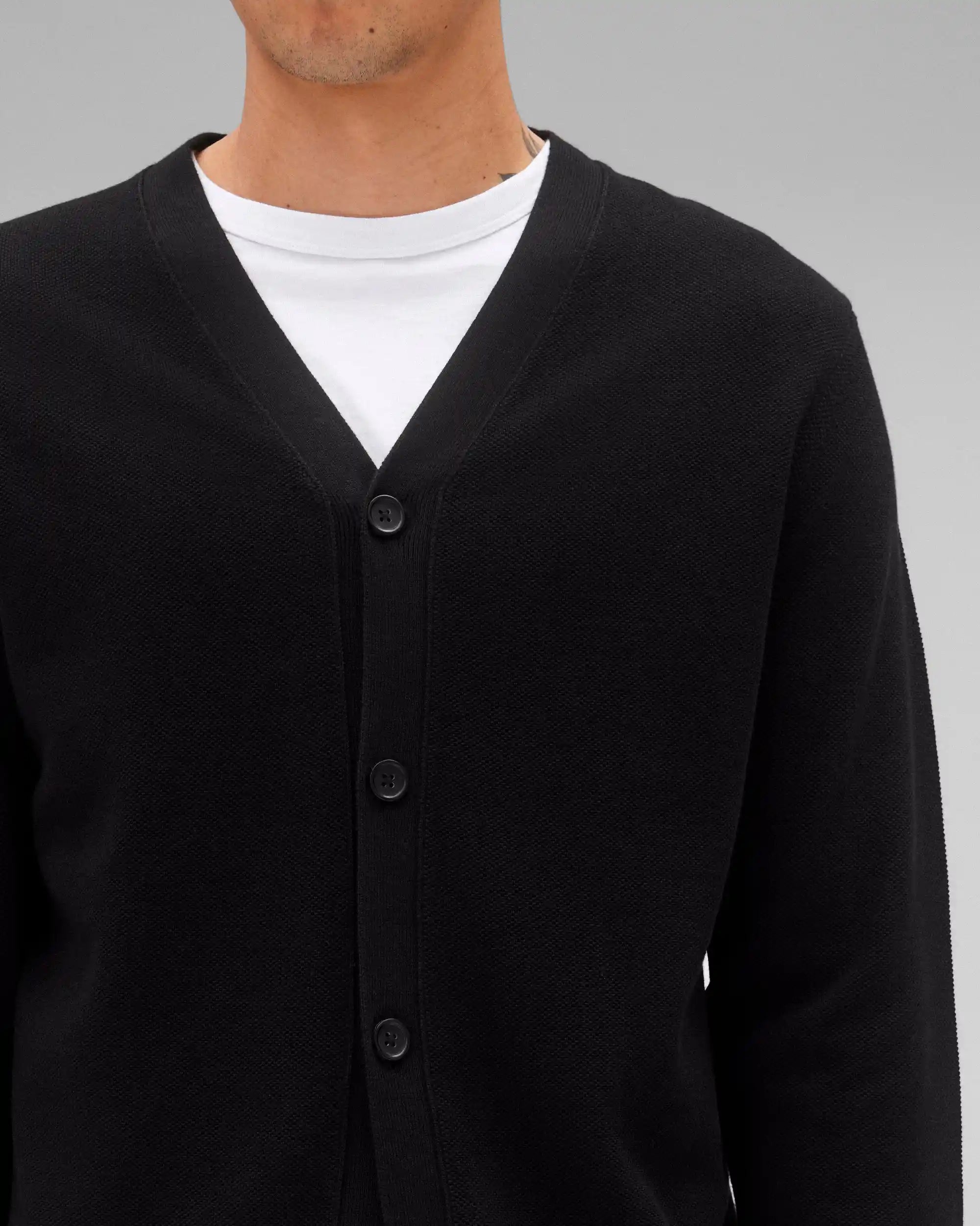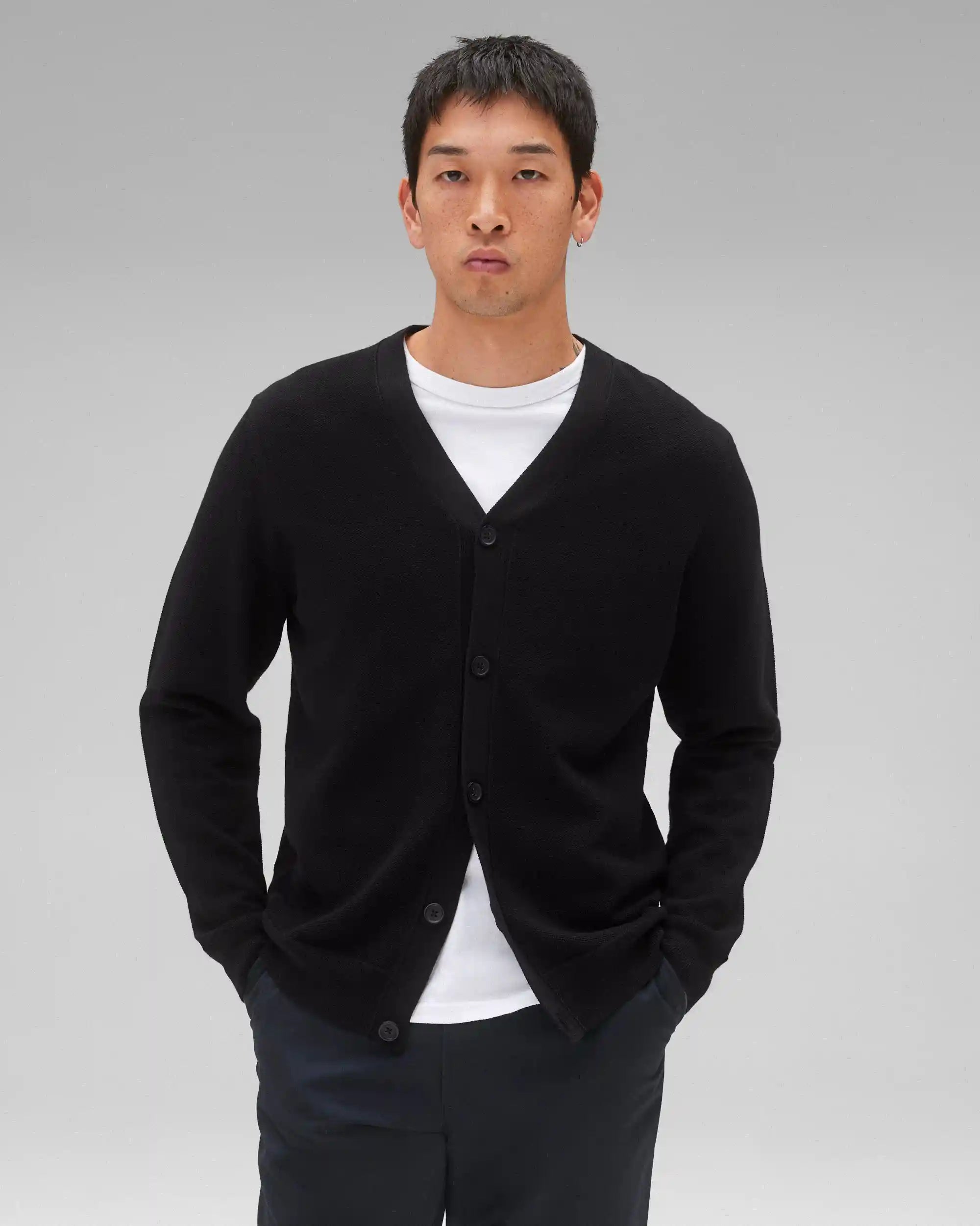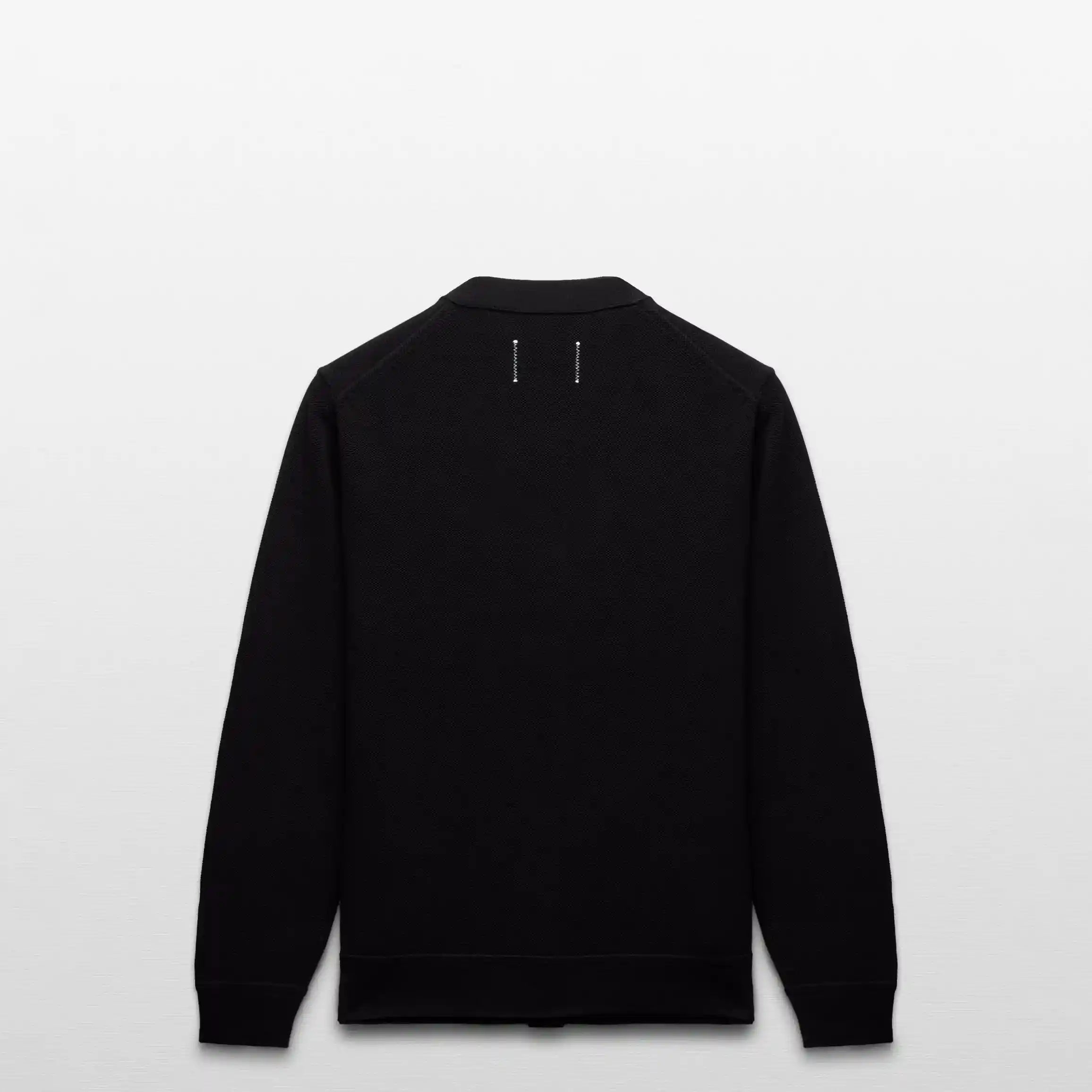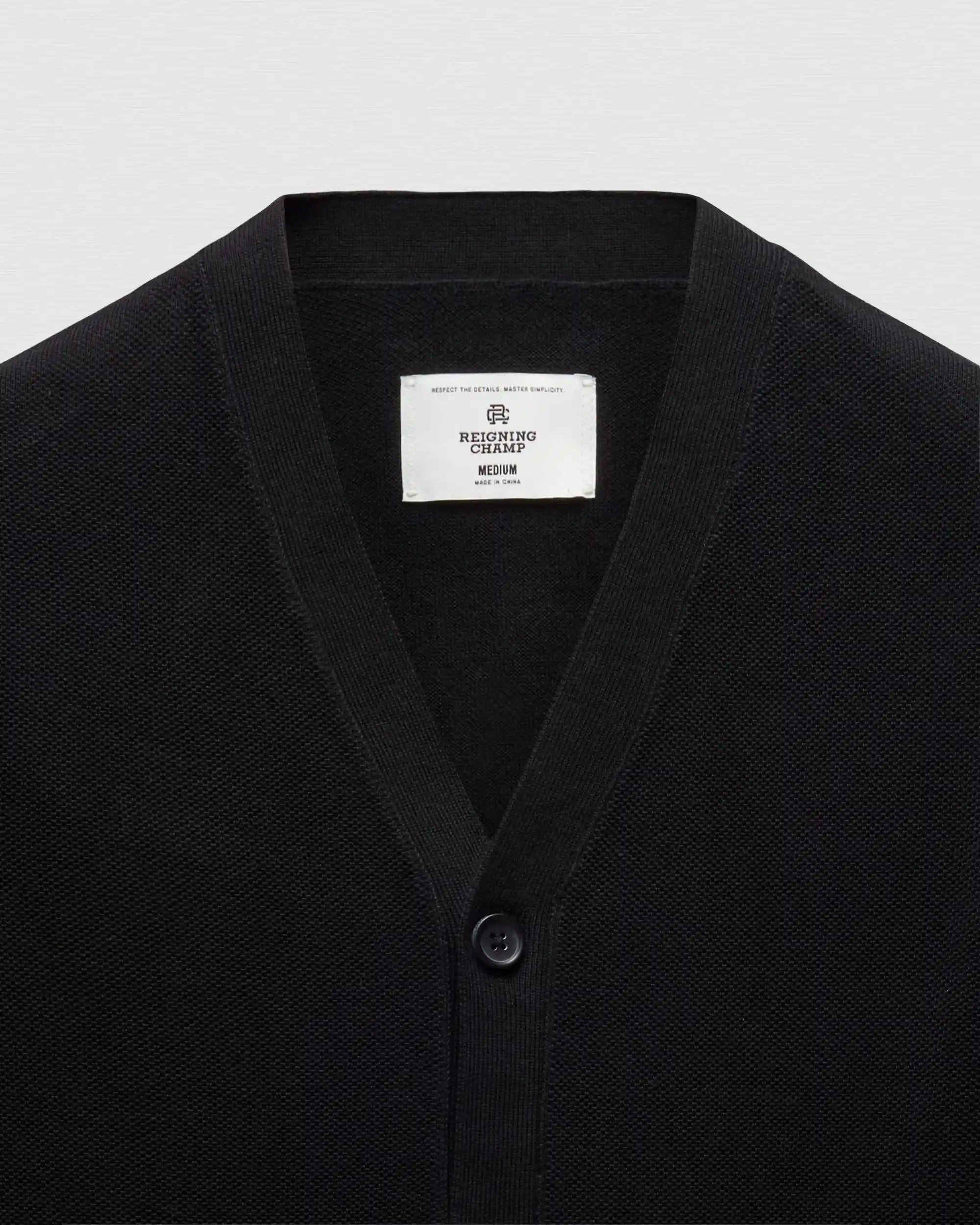 This pique knit cardigan is crafted breathable and fine-knit Supima cotton, renowned for its softness, longevity, and luxurious feel. Featuring a standard fit, with fully fashioned seams. Designed with seamless full needle placket and side gussets, logo branded buttons, and 1x1 rib cuffs, and hem.