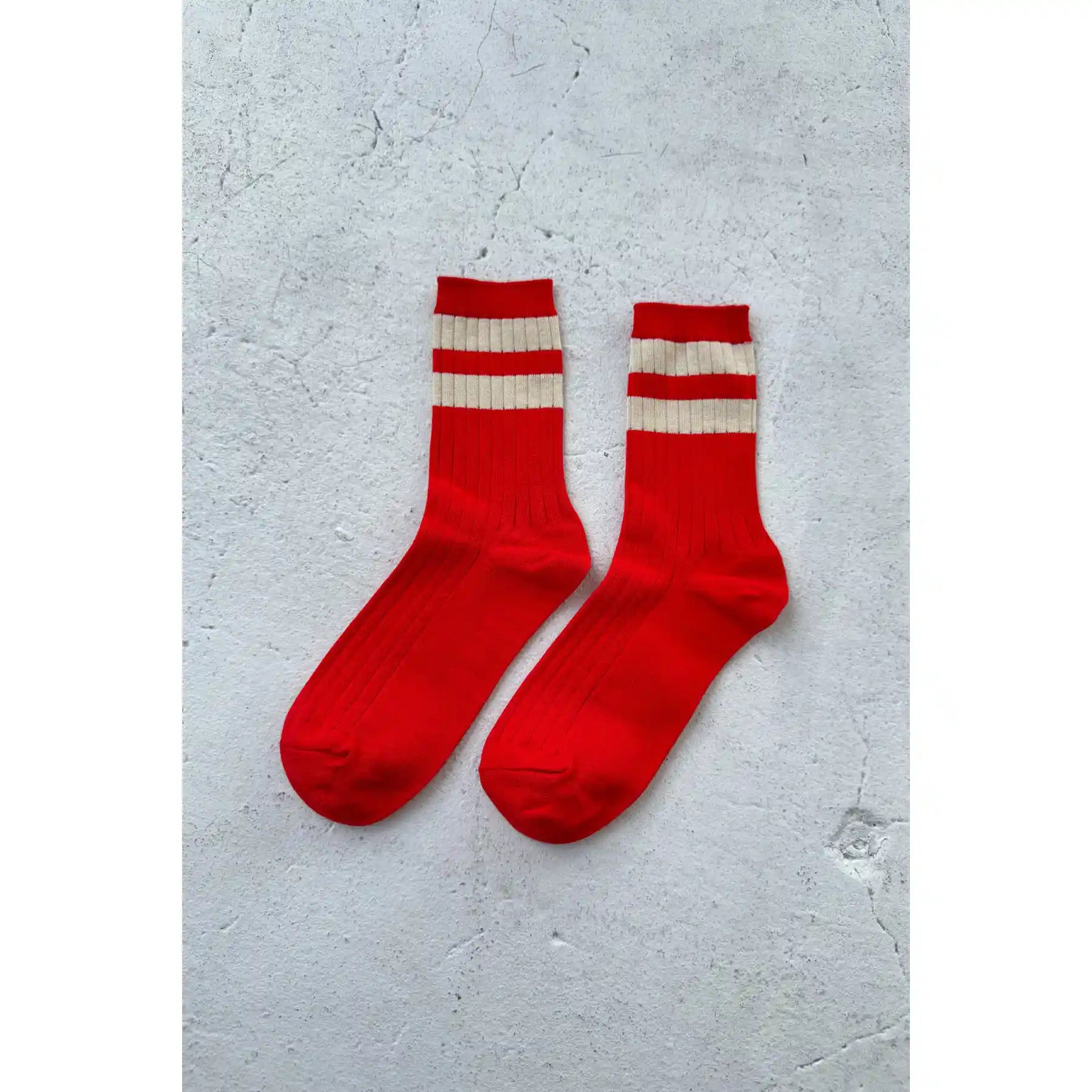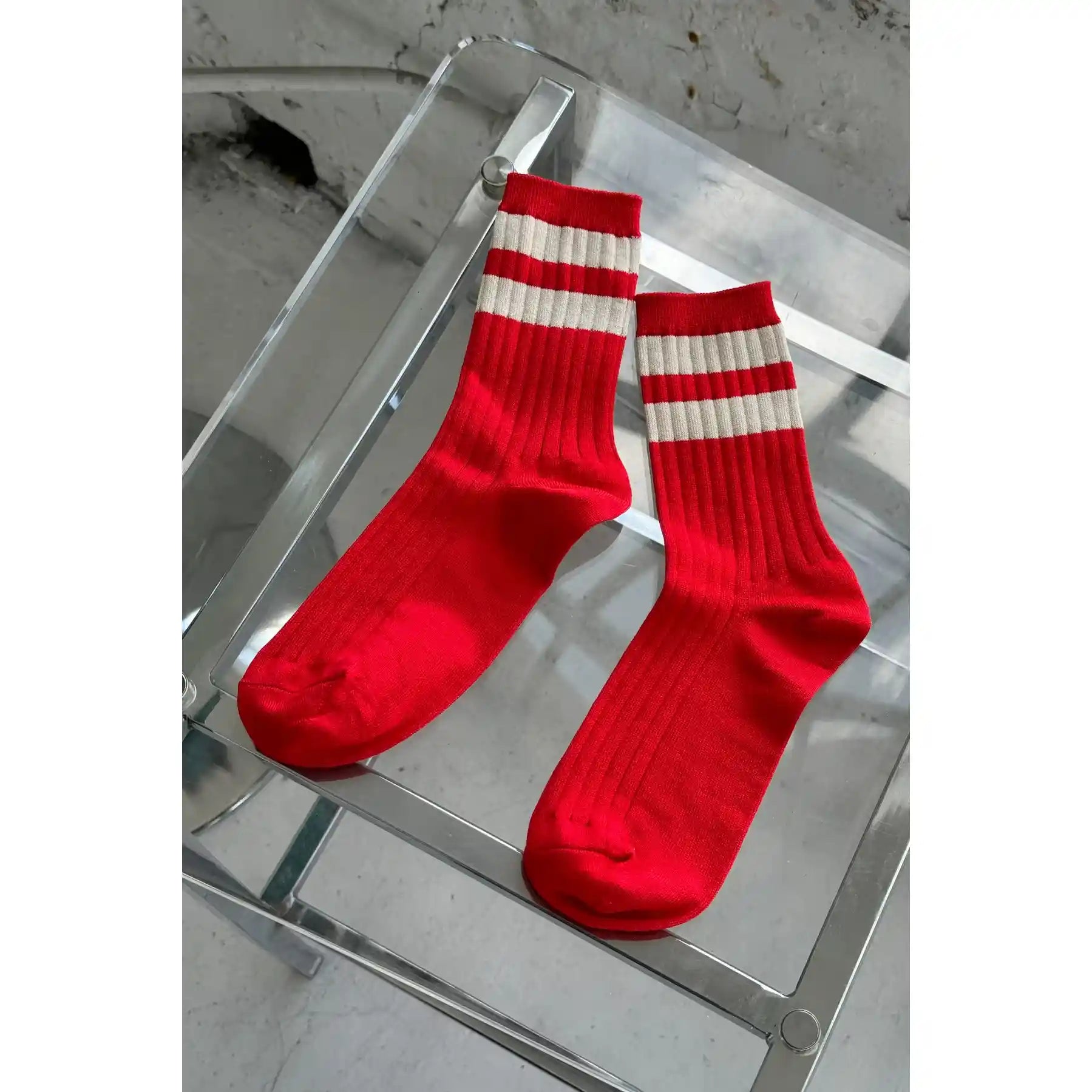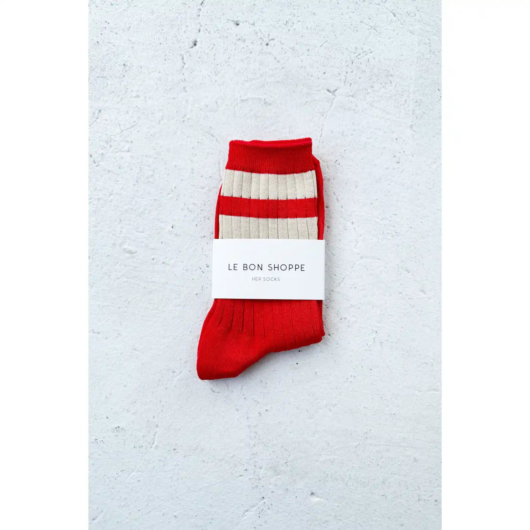 A bold varsity stripe is timeless and always a classic. Her Varsity Socks is a varsity striped version of Le Bon's OG Her Socks which are classically ribbed, perfect height, cotton blend durable, chic go to socks. Add an understated sporty touch to any look with this bold stripe contrast version of Her Socks. She loves to be worn with a mini skirt, plaids, and oversized cable knit sweaters.