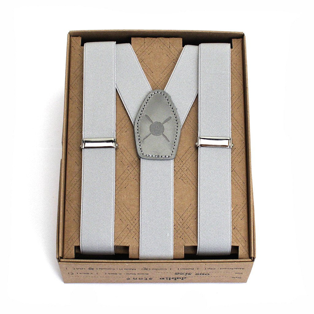 "Made in Canada, The Dublin 1" Stone Grey Combo Clip Braces, or Suspenders work as well with a suit as they do with shorts, and we're pretty impressed you're looking at this handsome accessory. One of the features of these is that they come with both button in straps and clip in fasteners so you can choose on the day, depending on which way the mood strikes you. We're in no way anti-belt, we just love having options, and you'll notice as soon as you walk outside, that strangers love your options too... Brace yourself!"