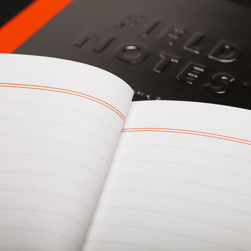 Inside, you’ll find “Bright White” Finch Fine Smooth 70# text paper, a brighter-white version of the paper found (and beloved) in our “America the Beautiful” limited edition. It’s ruled in “Frost Gray” with a double-rule of “DDC Orange” up top.