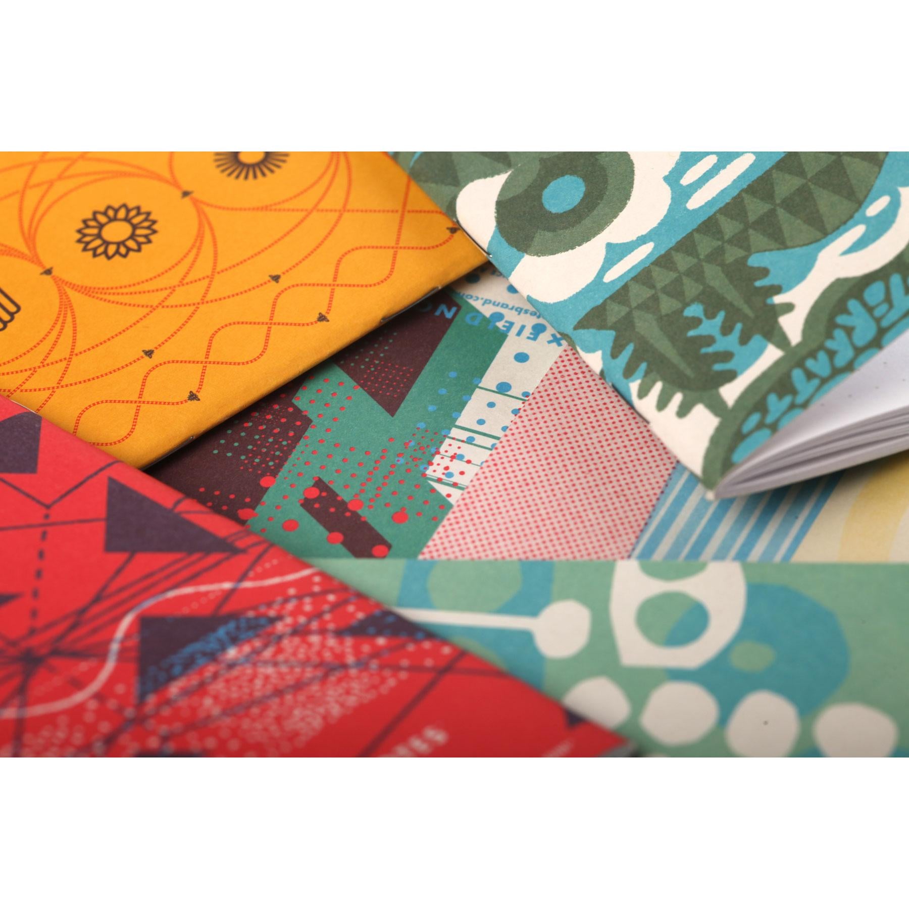 All six books feature French Construction 100# “Grout Gray” covers with red, blue, and yellow spot inks. Bodies are Finch Opaque 60# “Bright White” text-weight with a light gray dot-grid. The set is packaged in a durable, custom-made slipcase that’s been constructed with the same paper and ink for a perfect match.