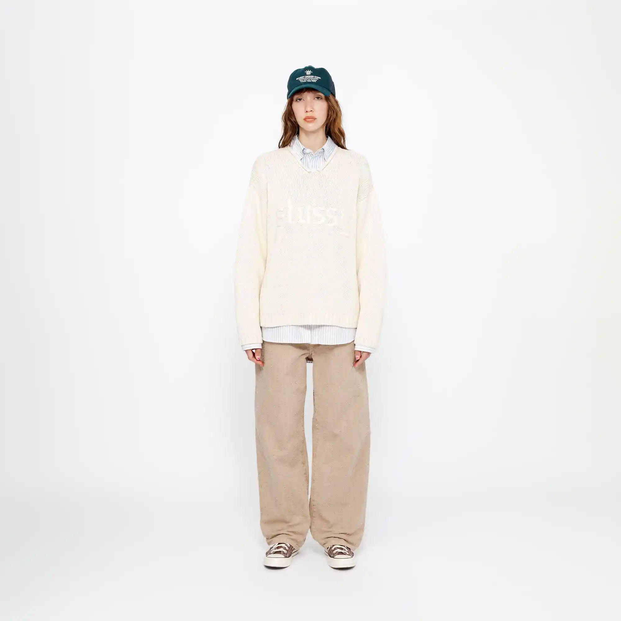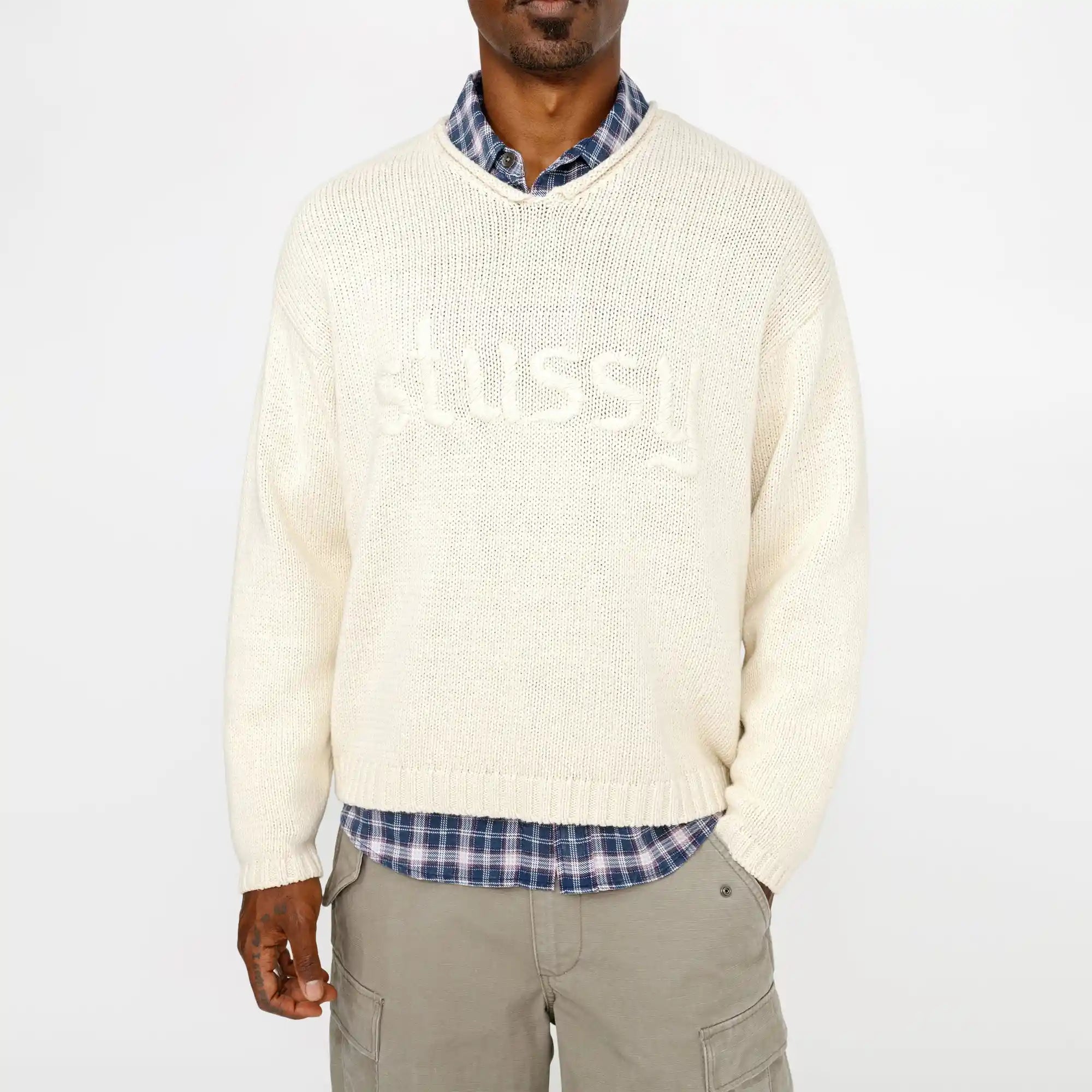 Stussy Roll V-Neck Logo Sweater, natural