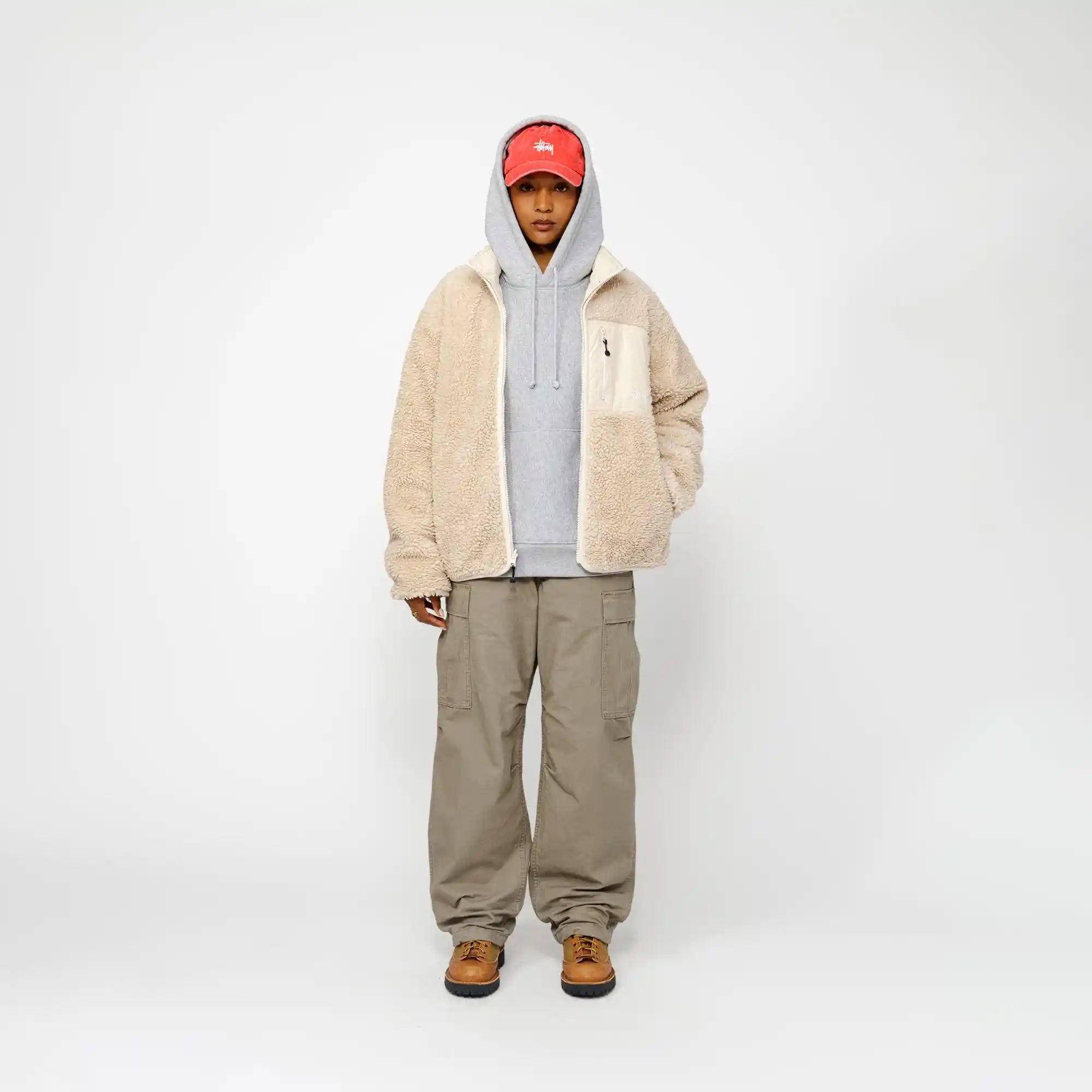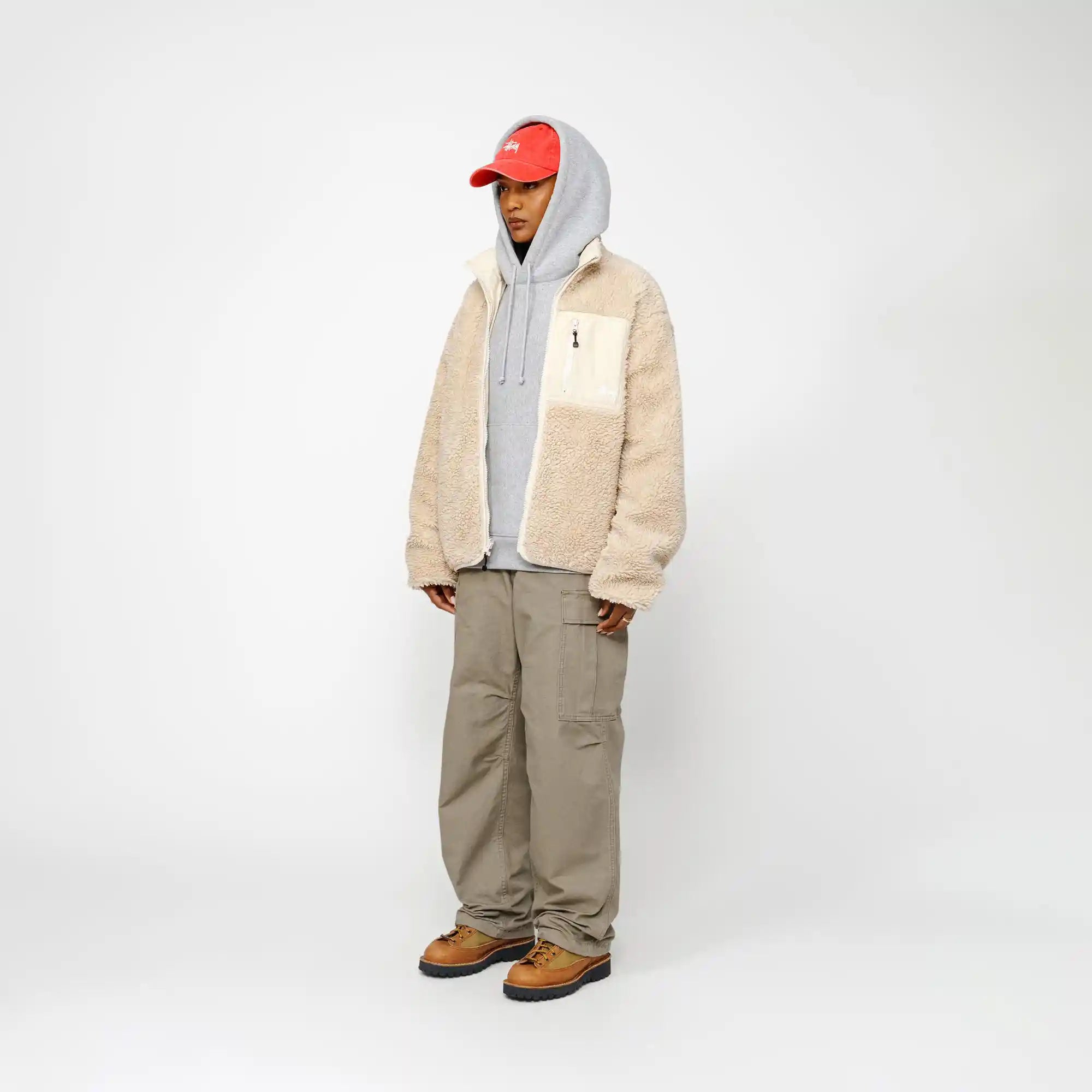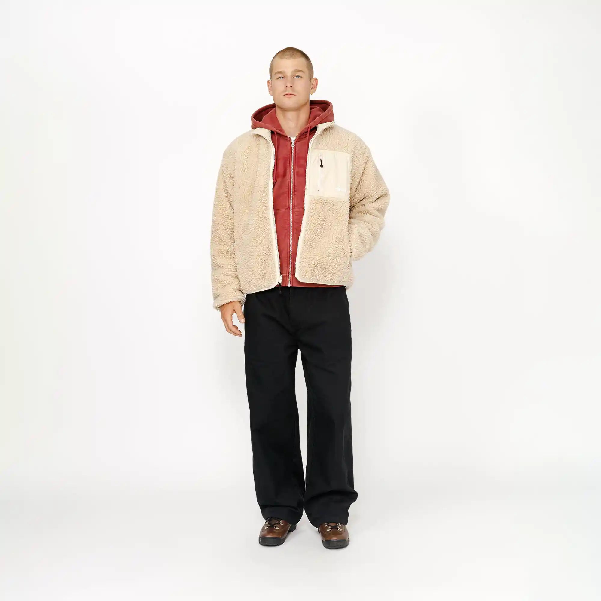 Classic fit reversible jacket. Sherpa fleece exterior with a zip closure, nylon pockets and Stüssy stock logo embroidery. Nylon interior with welt pockets and the Stüssy stock logo screenprinted at the chest.