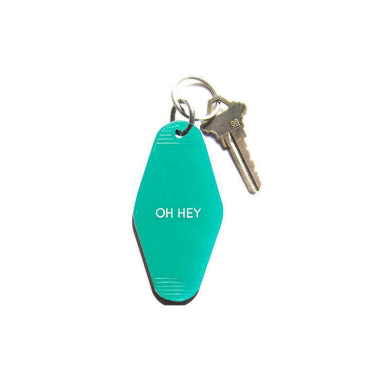 Three Potato Four Oh Hey keychain. Translucent turquoise. Imported.